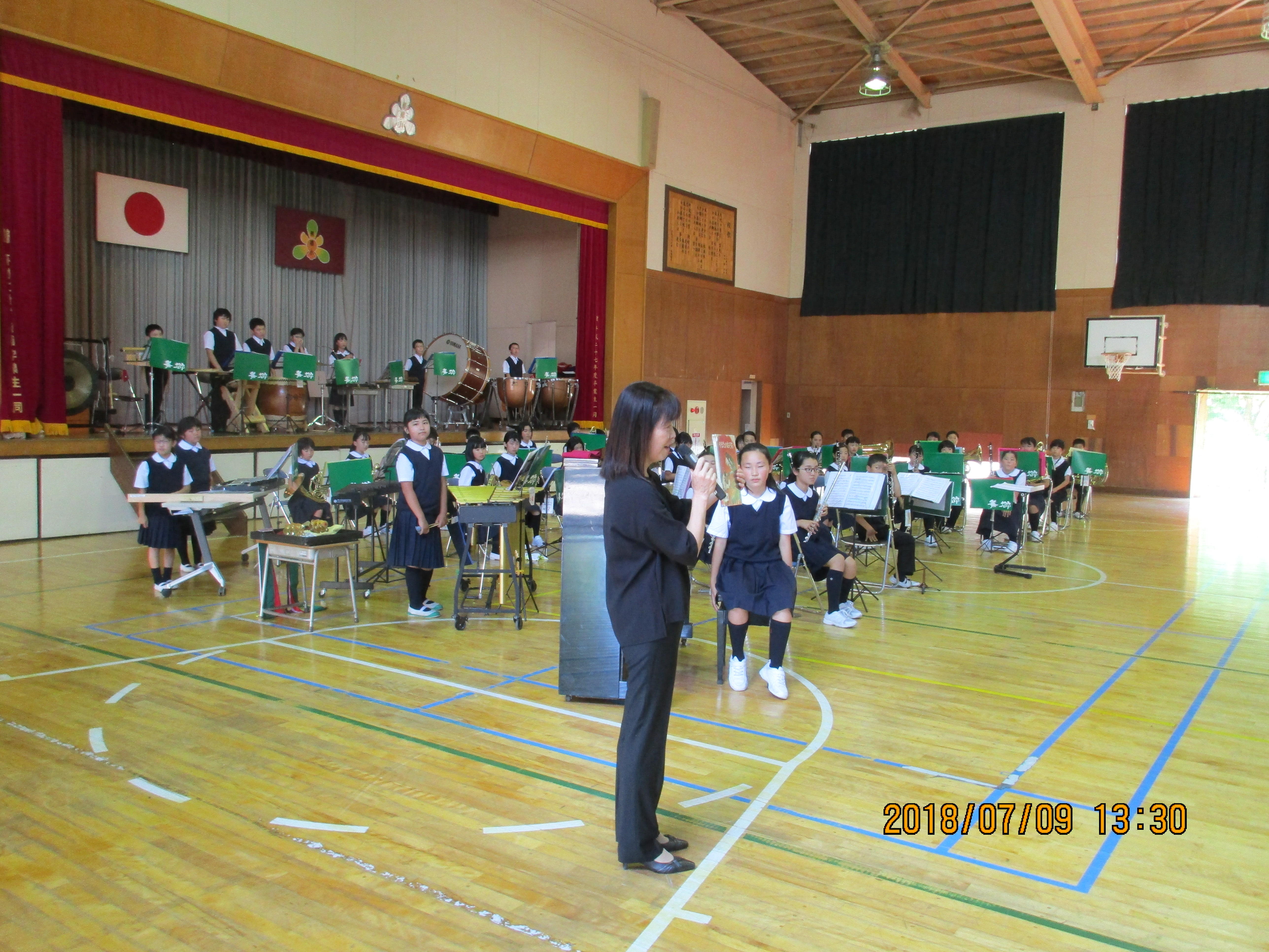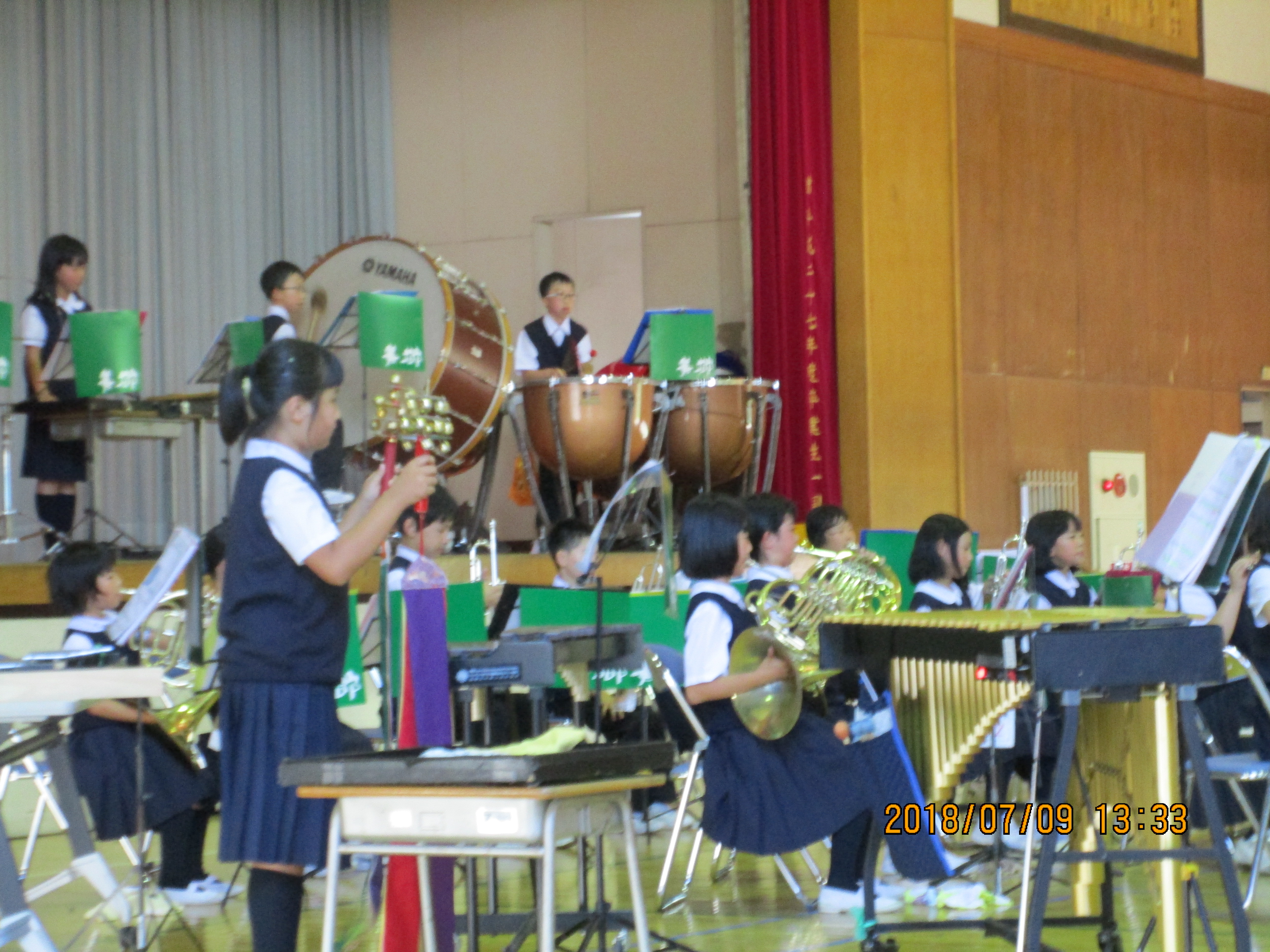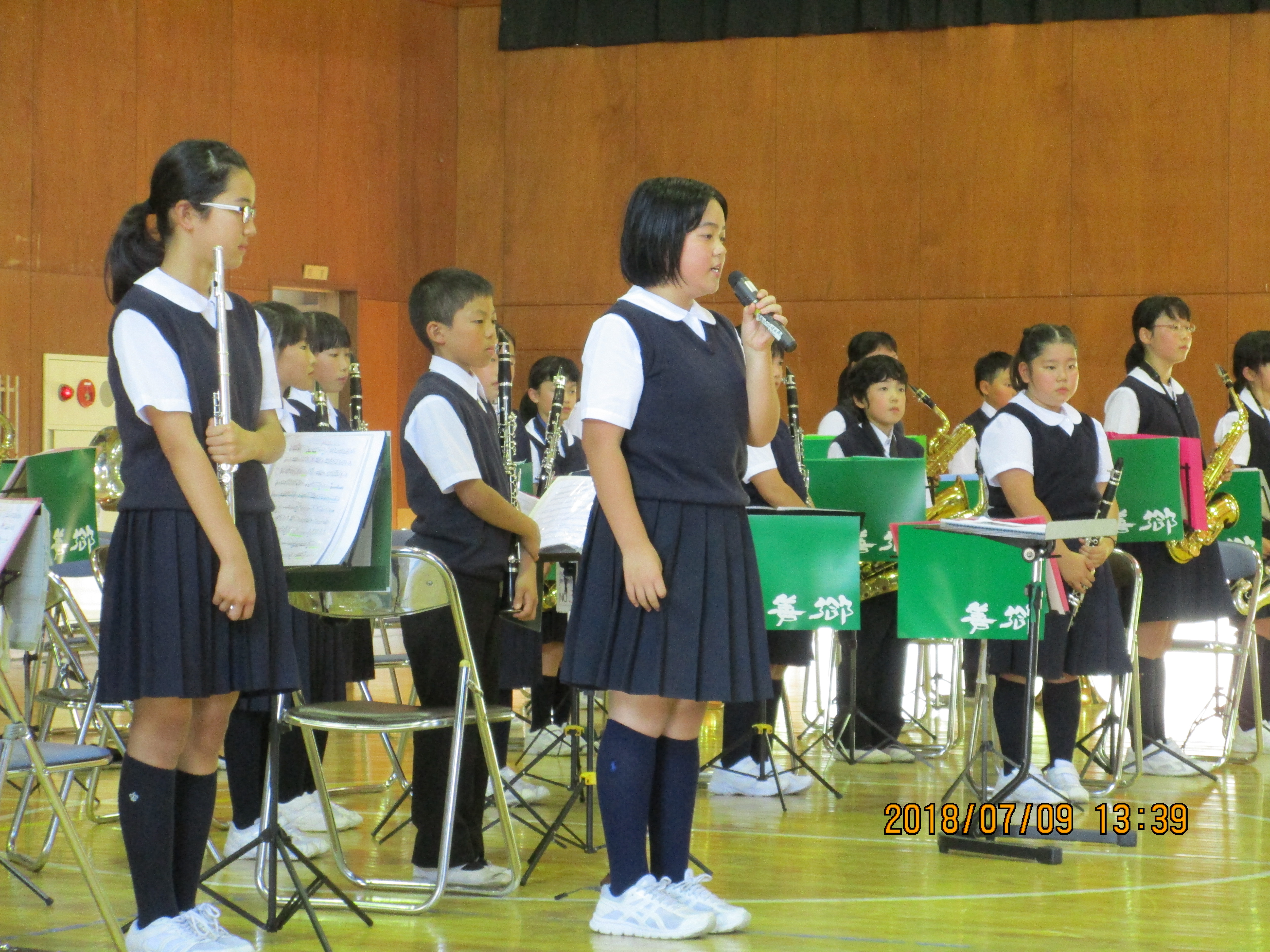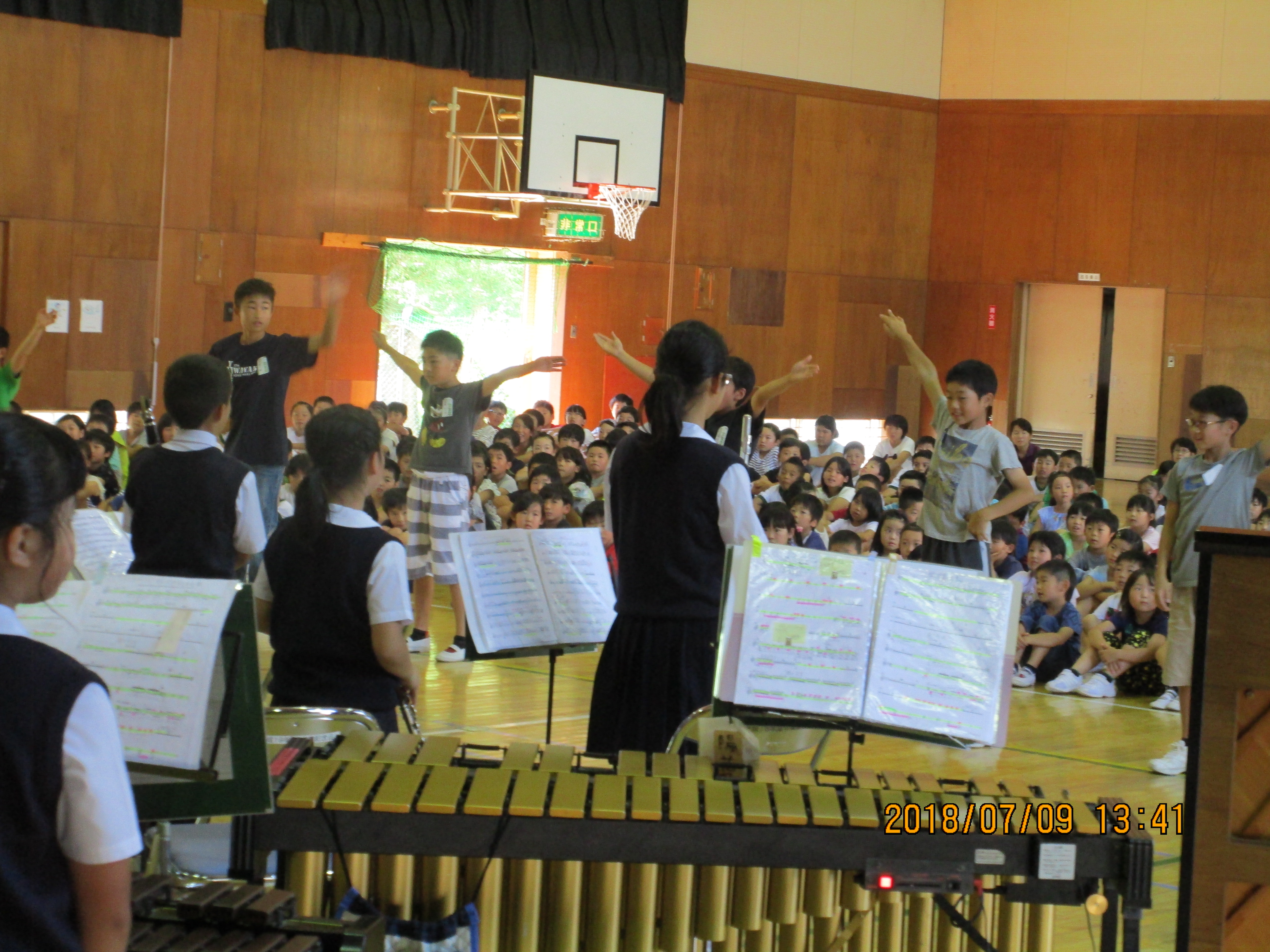 吹奏楽クラブは今年は3年生も入部して46名の出場です。曲は「斐伊川に流るるクシナダ姫の涙」です。指揮者の皆川先生から曲についての説明がありました。「ヤマタノオロチ退治神話」を想像できるスケールの大きな曲です。一人一人が心を合わせてすばらしい演奏を聞かせてくれました。誰もが真剣になって聞き、音楽のすばらしさを受け止めて感動しました。