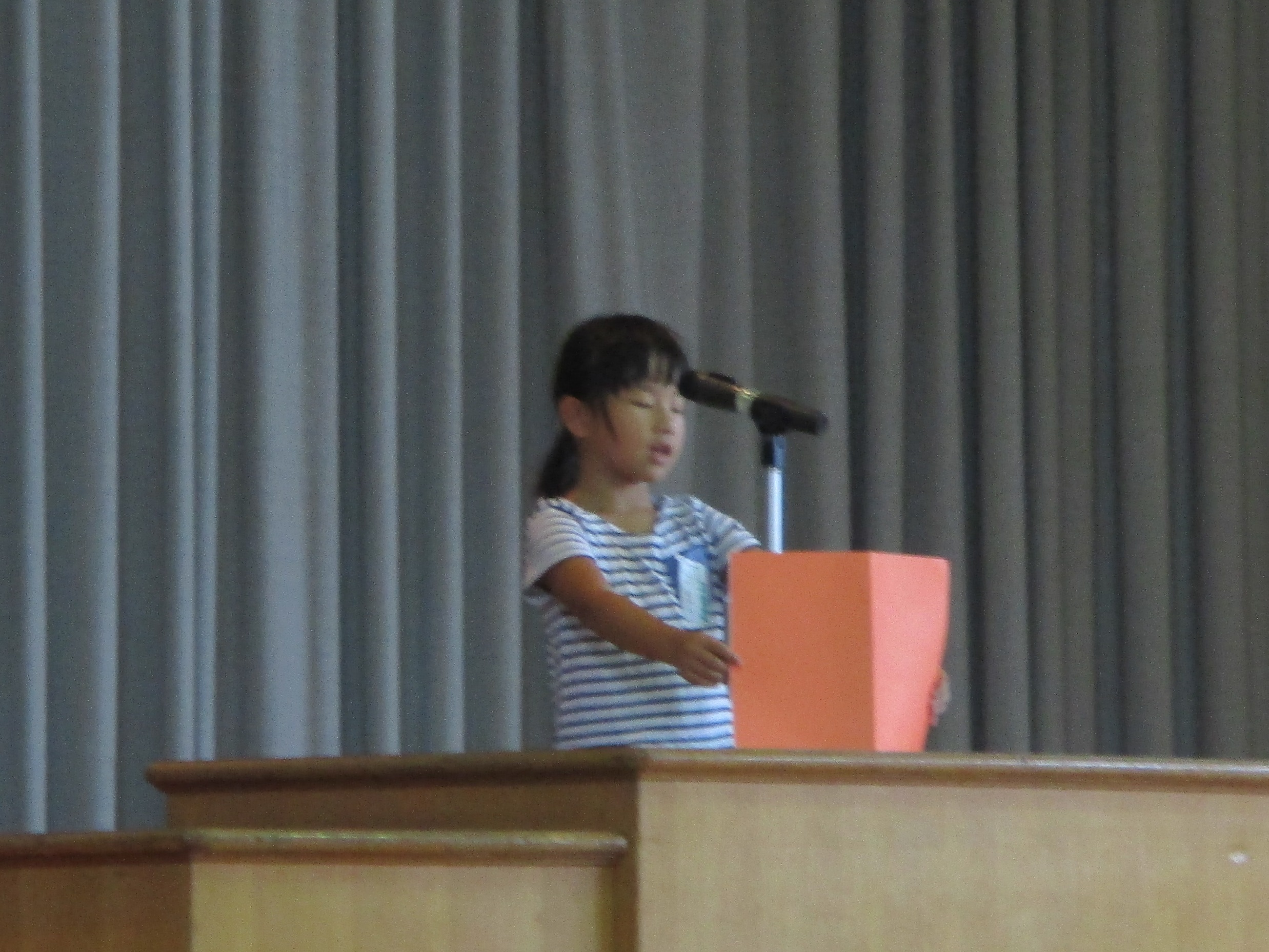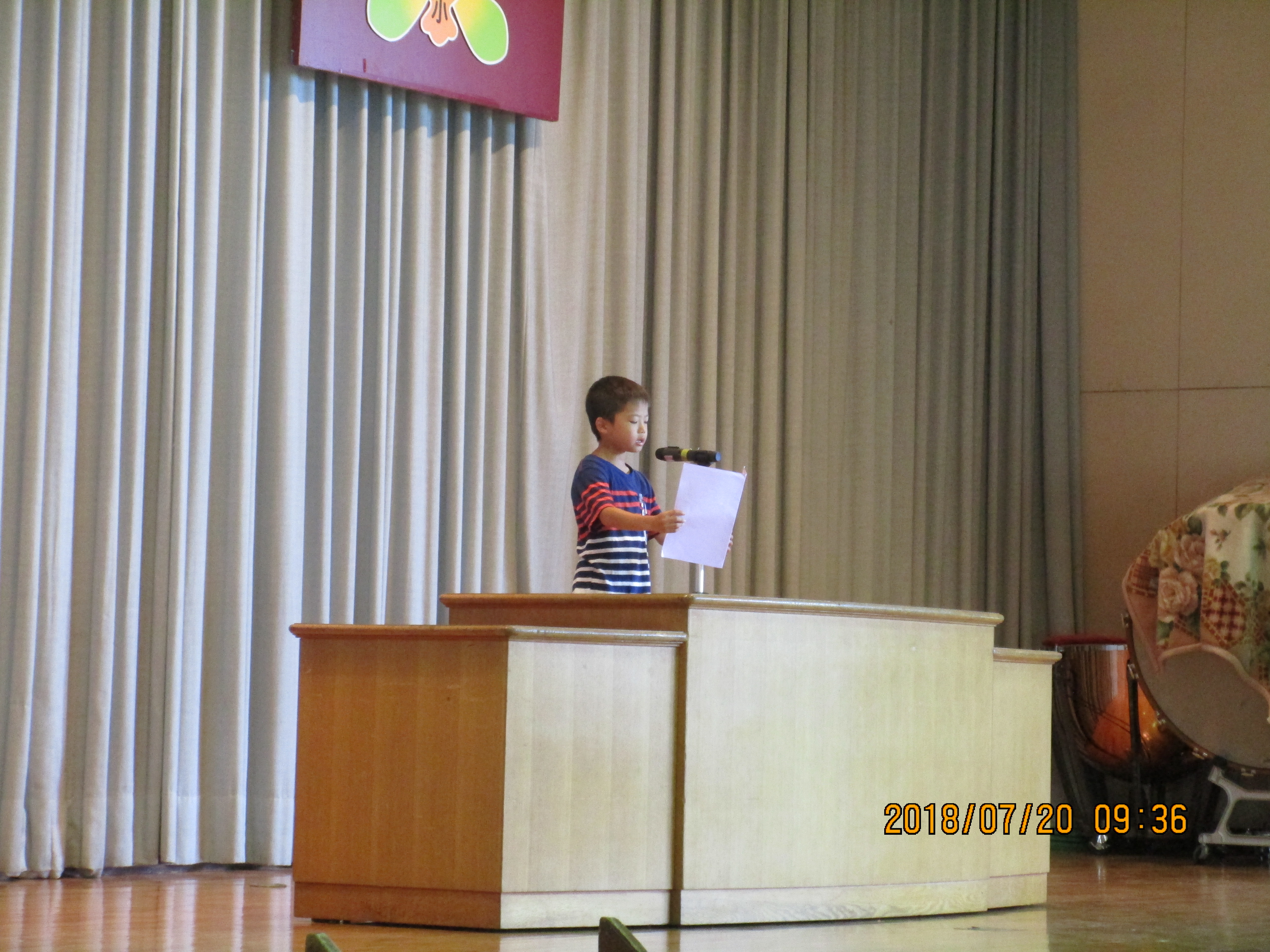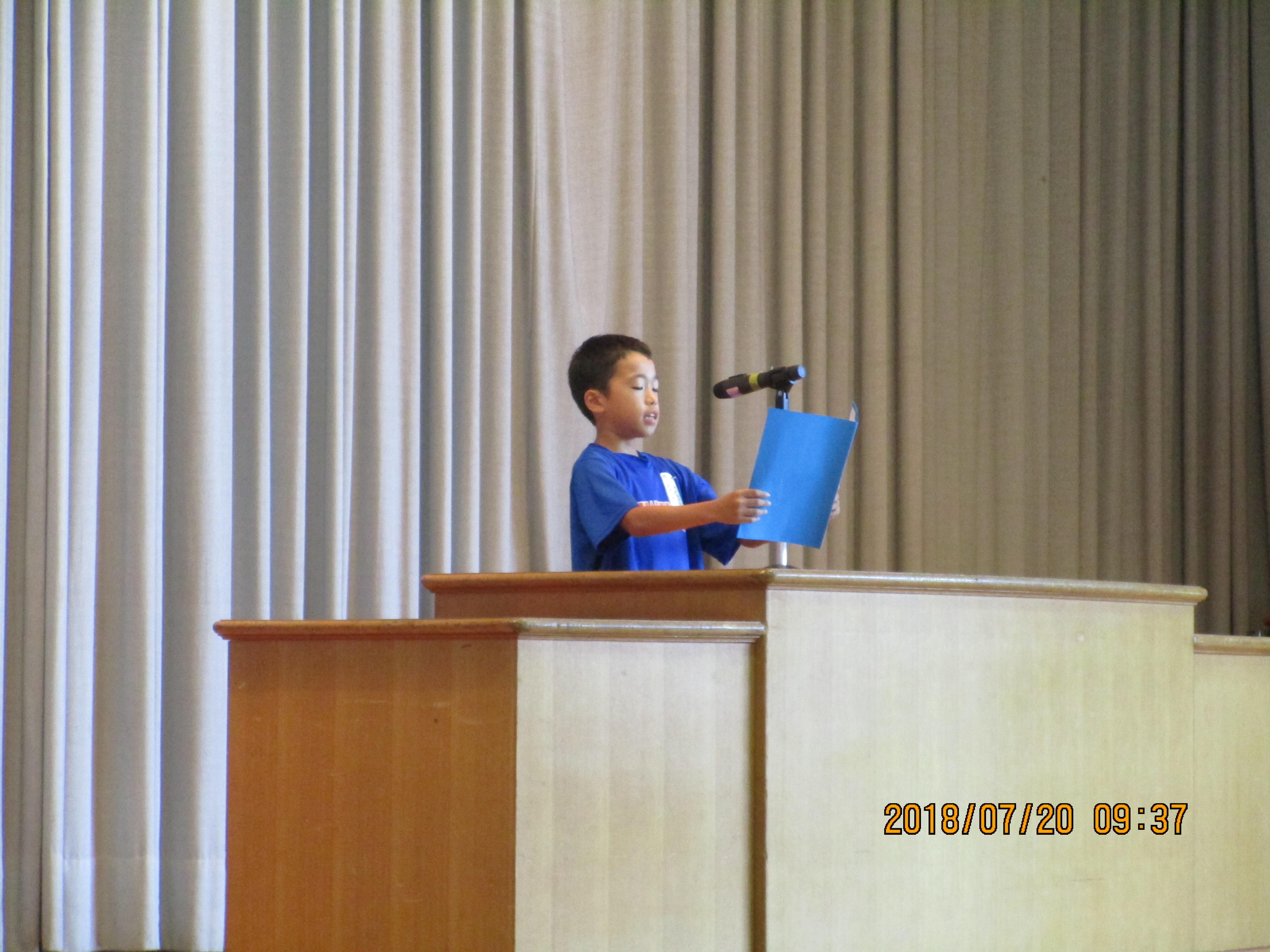 2年生の根本旺甫さん、4年生の矢内亘さん、6年生の平賀大道さんが1学期がんばったことの発表を行いました。大きな声で自信をもって発表できてすばらしかったです。