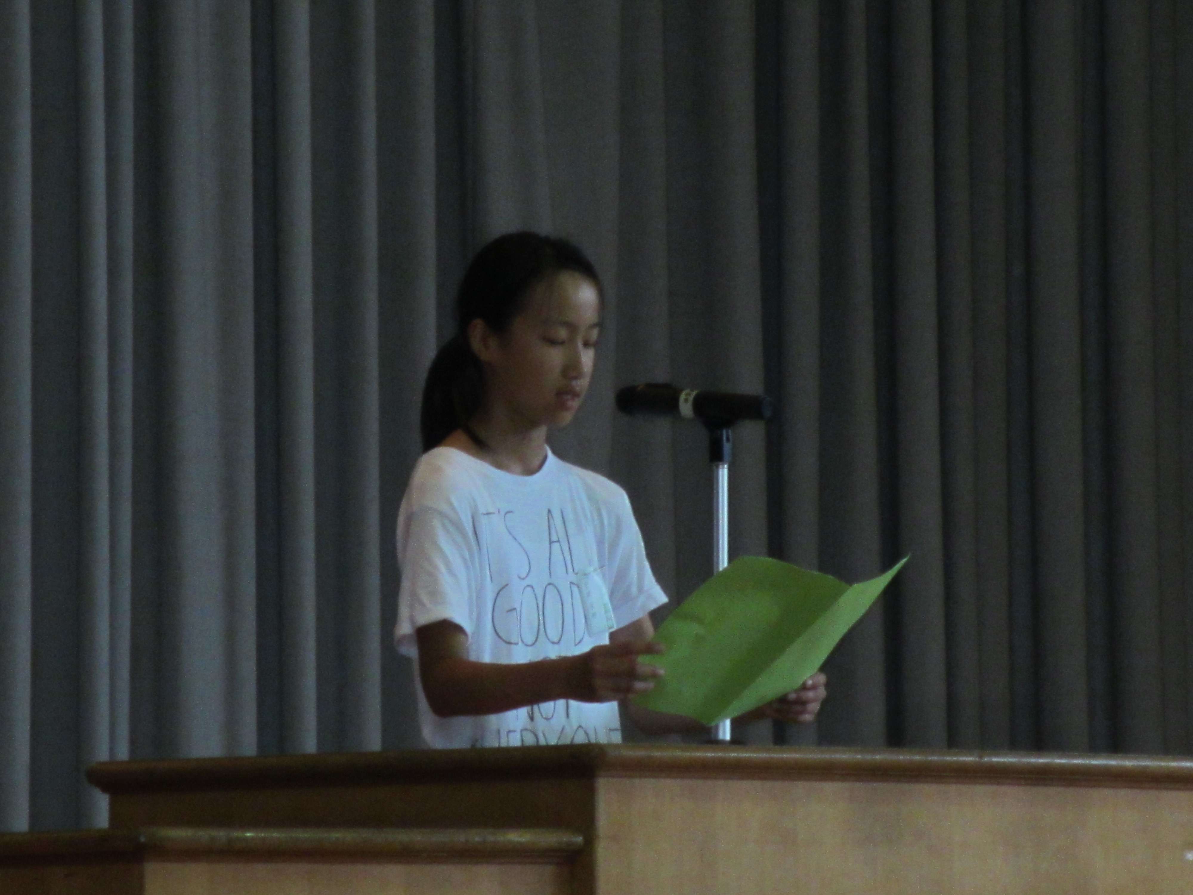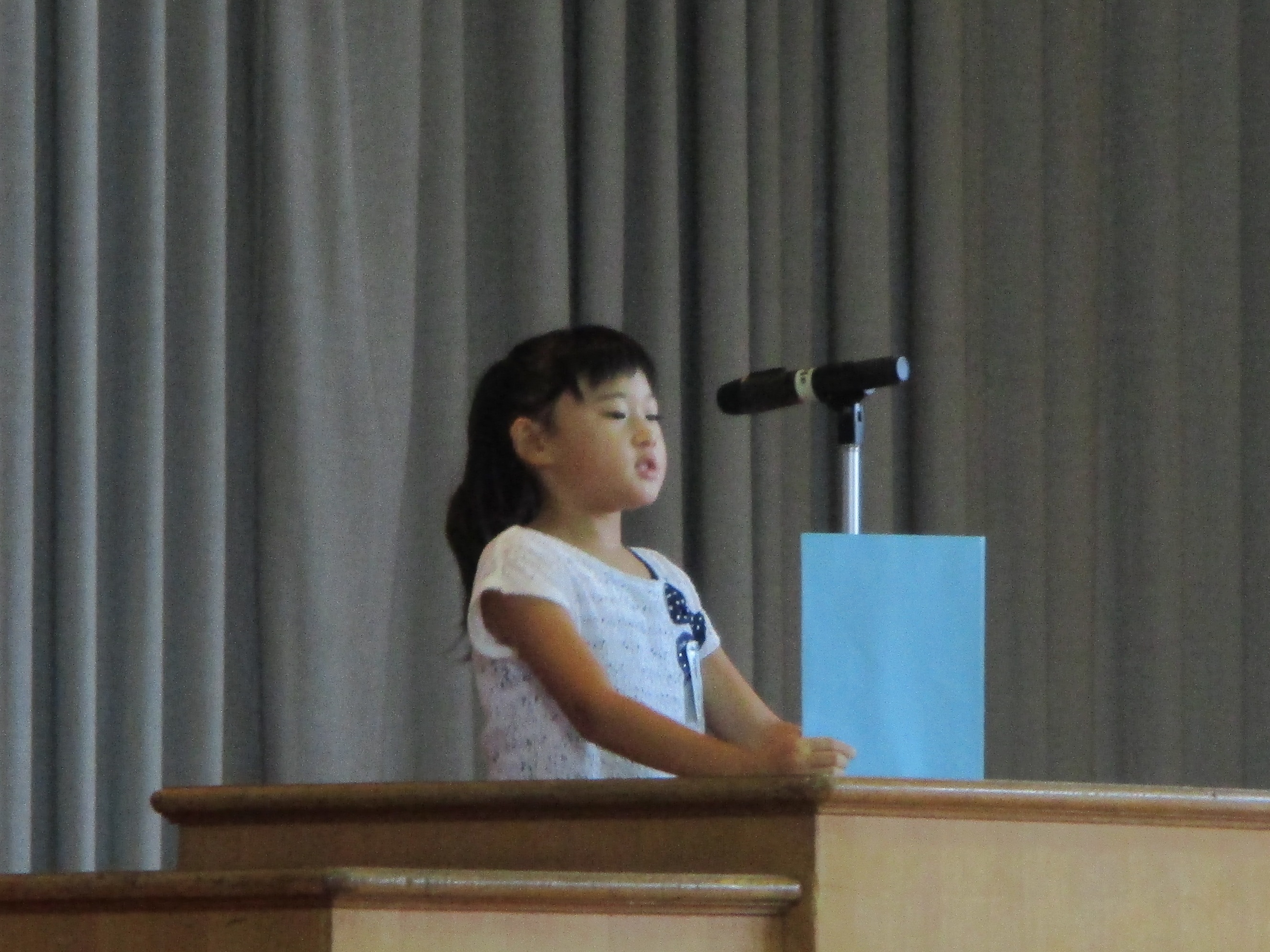 1年生の星凪望乃さん、3年生の薄葉しおんさん、5年生の岩橋采那さんが2学期にがんばりたいことの発表をしました。大きな声で堂々と発表ができてすばらしかったです。
