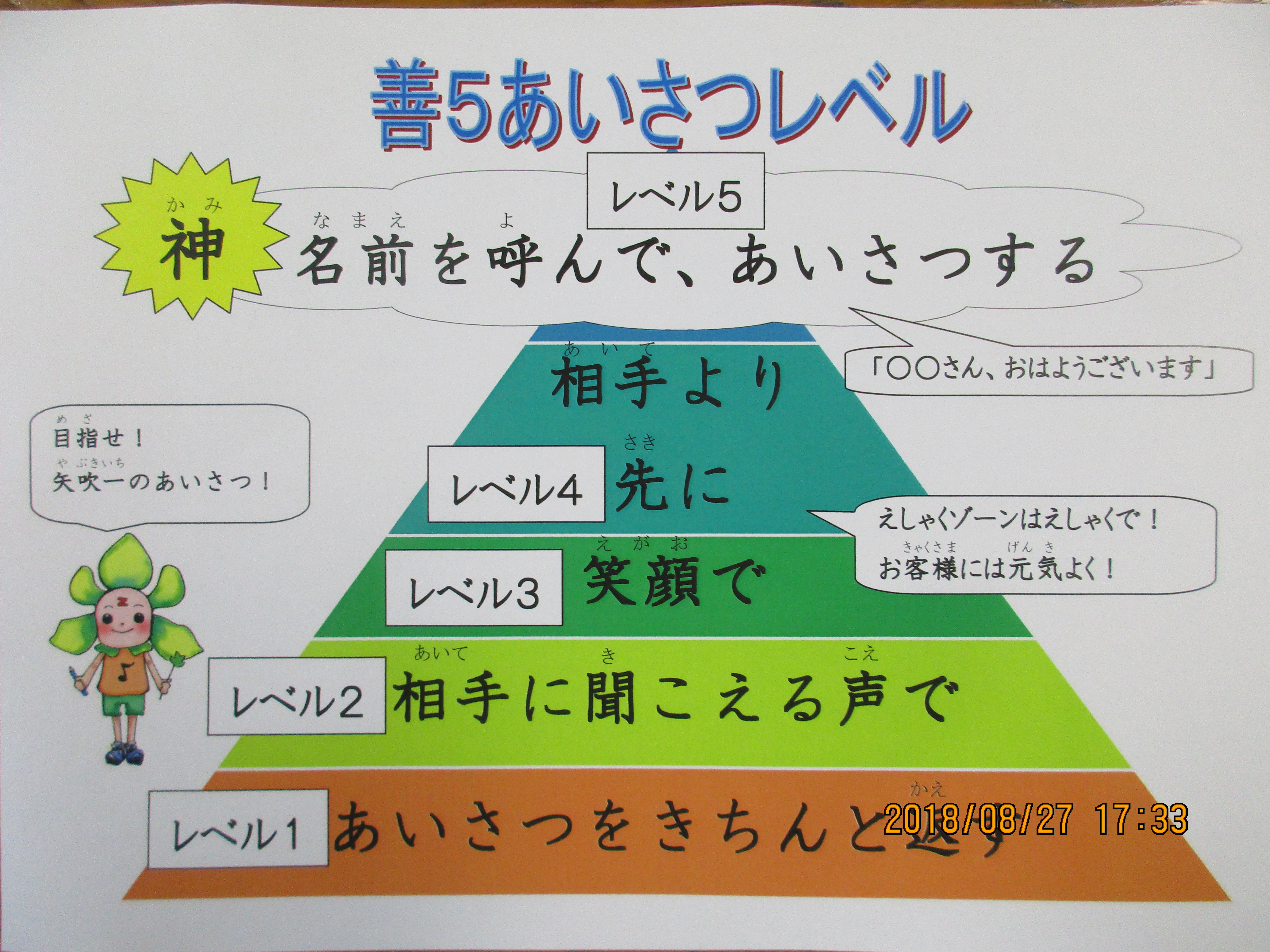 善郷小学校では学級で、学校で、家庭で、地域で「笑顔であいさつ」「気づき 考え 行動できる子ども」を目指しています。2学期から「善5あいさつレベル」の実践を呼びかけることになりました