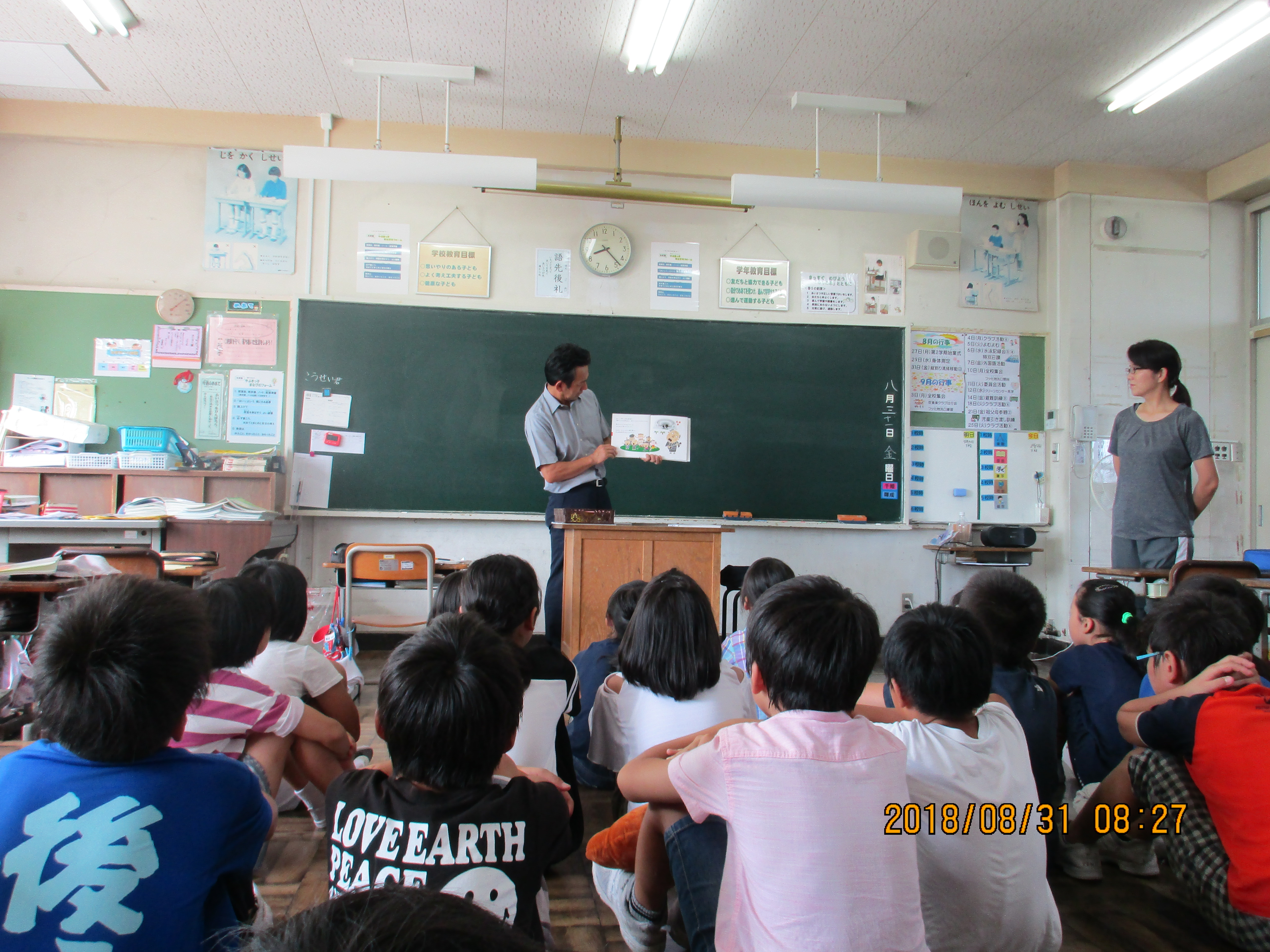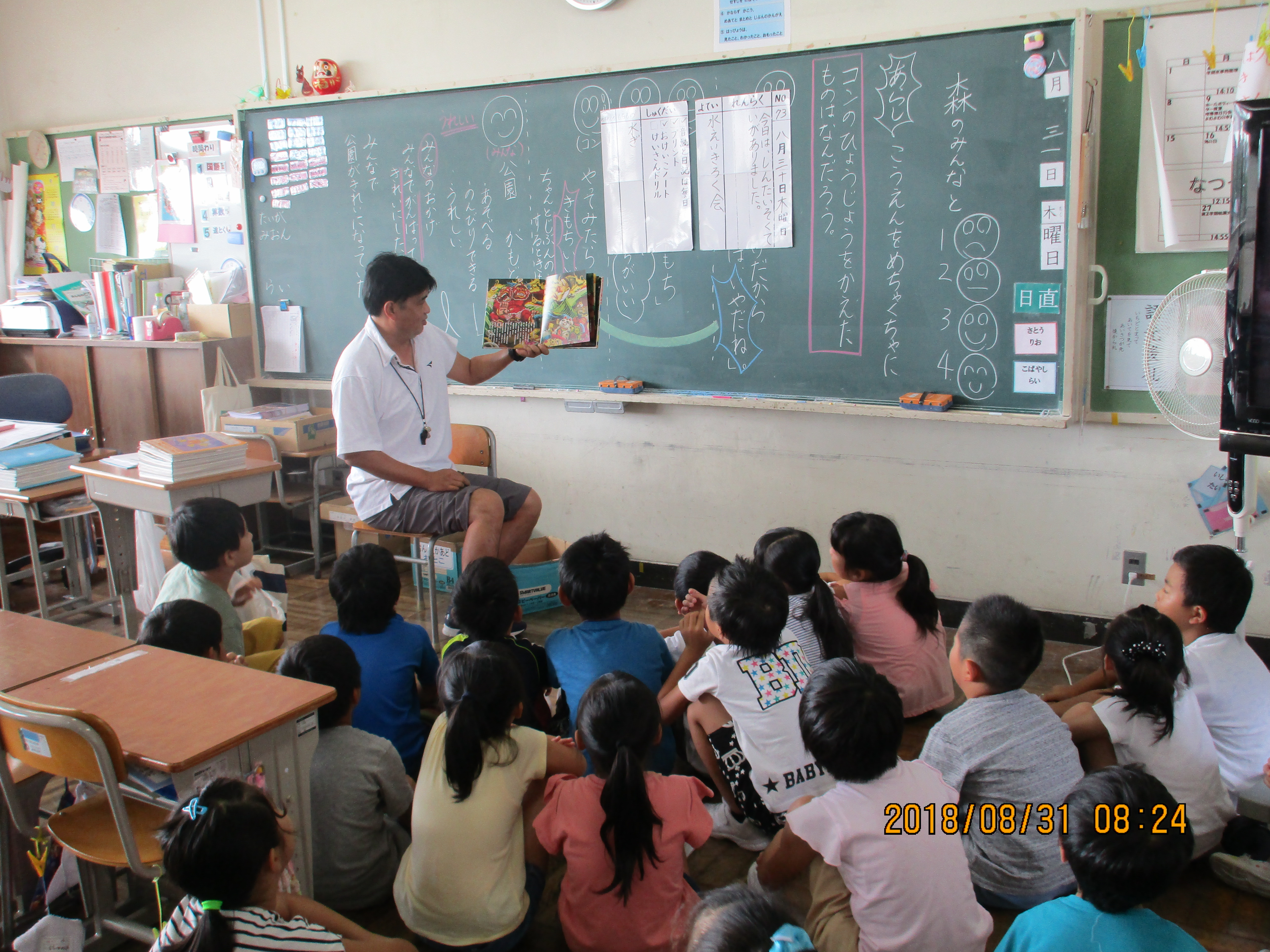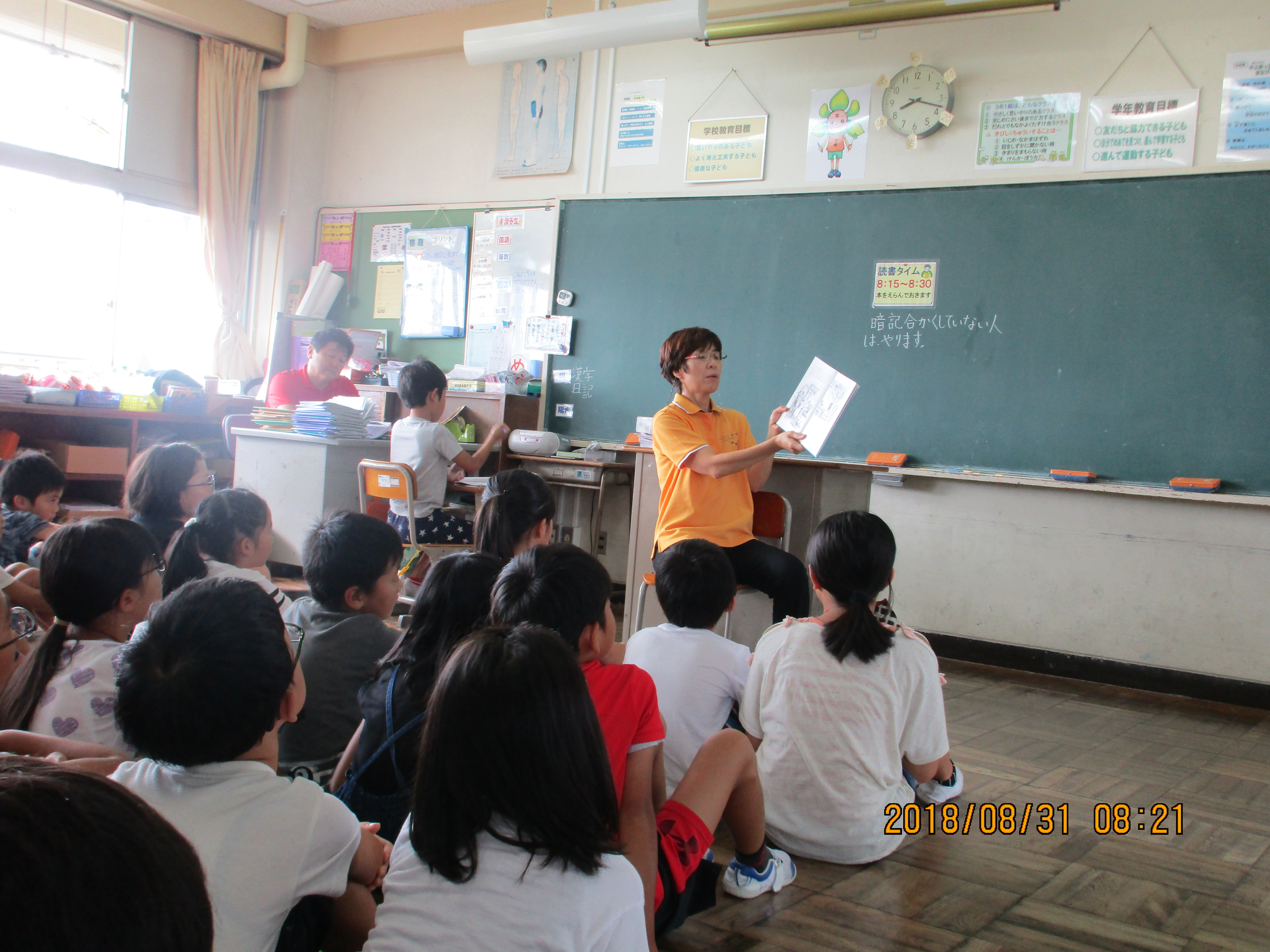 朝の読書タイムの読み聞かせがありました。今日は10名の読み着せボランティアの皆さんに各教室で読み聞かせをしていただきました。子どもたちも読み聞かせを楽しみにしています。みんな目を輝かせてお話を聞いていました。2学期もどうぞよろしくお願いします。