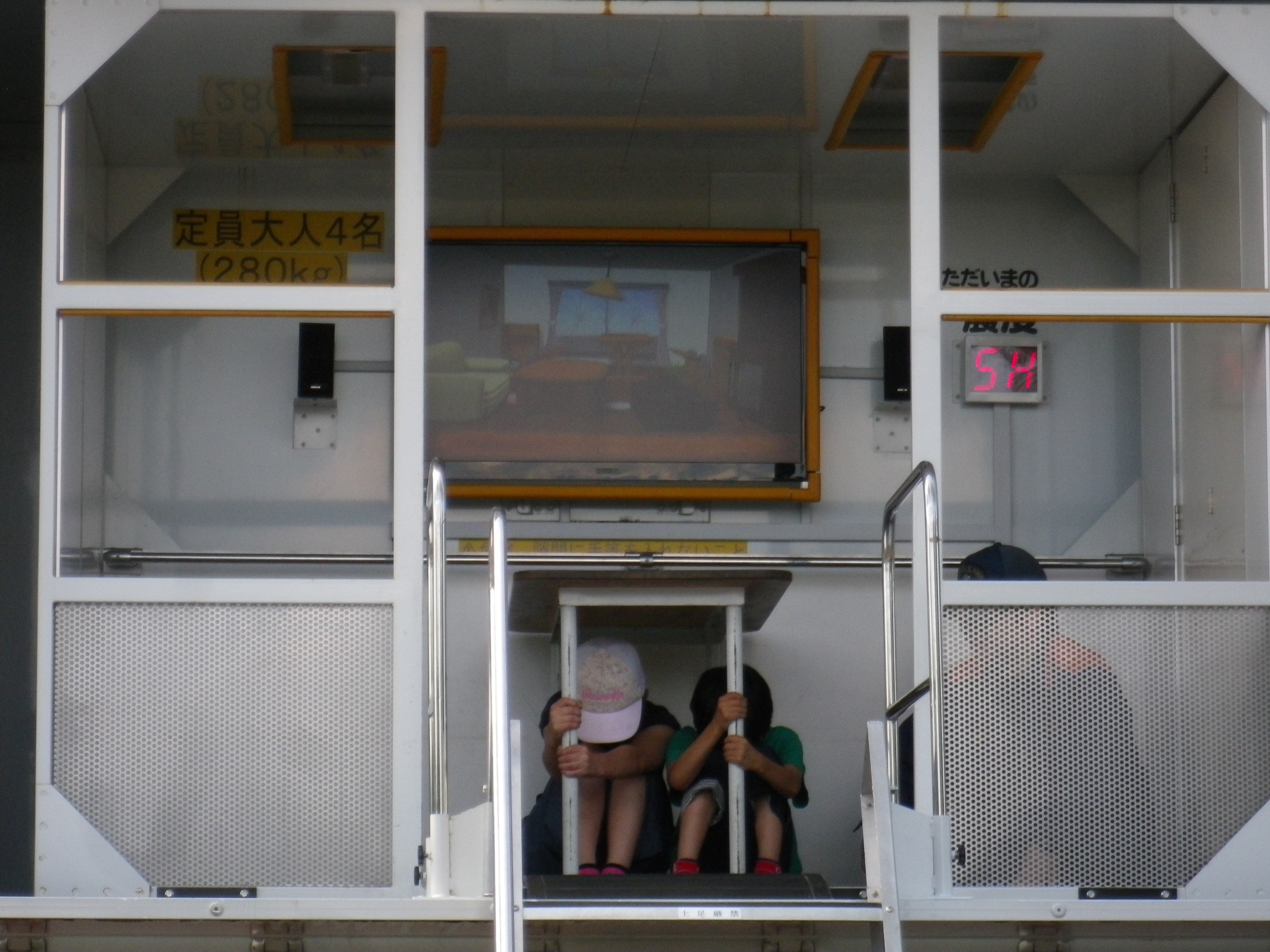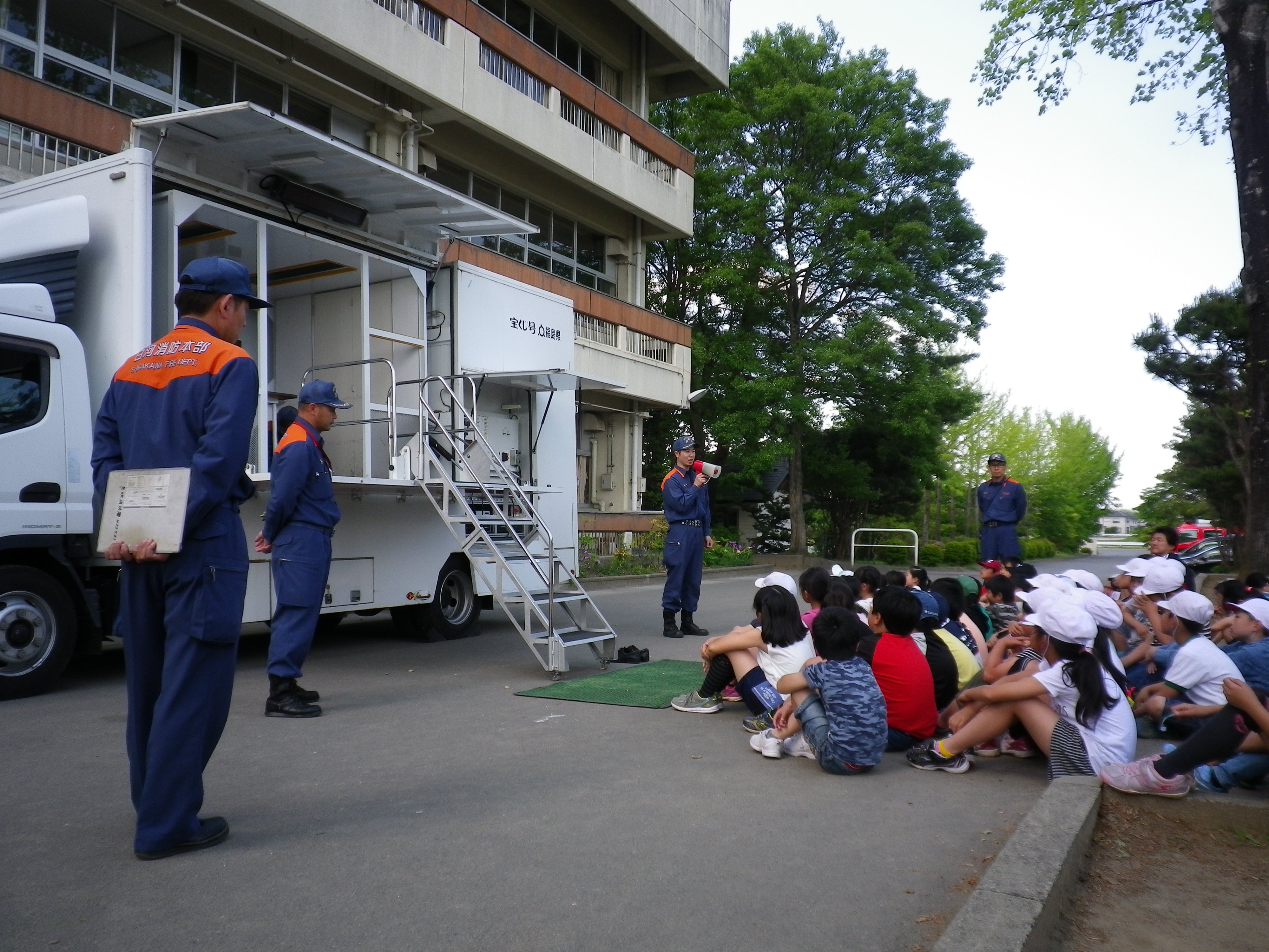 昨日、学校に起震車がやって来ました。起震車とは? 人工的に地震を起こし大きな地震を体験できる車のことです。テレビなどでごらんになっていると思いますがトラックの荷台に小さな部屋を作ってありそこで地震を体験できます。2年・3年・4年生を対象に行い、矢吹消防署にお願いして来てもらいました。始めに消防署の署員の方々から地震の時の対応についてお話をうかがいました。そしていよいよ代表を決めて体験です。警報がなって 揺れ始めると「わーすごい・こわい」体験した子どもたちは声も出ません。署員の方から震災の時はこの揺れより大きく、しかも長く続いたことを知らされました。