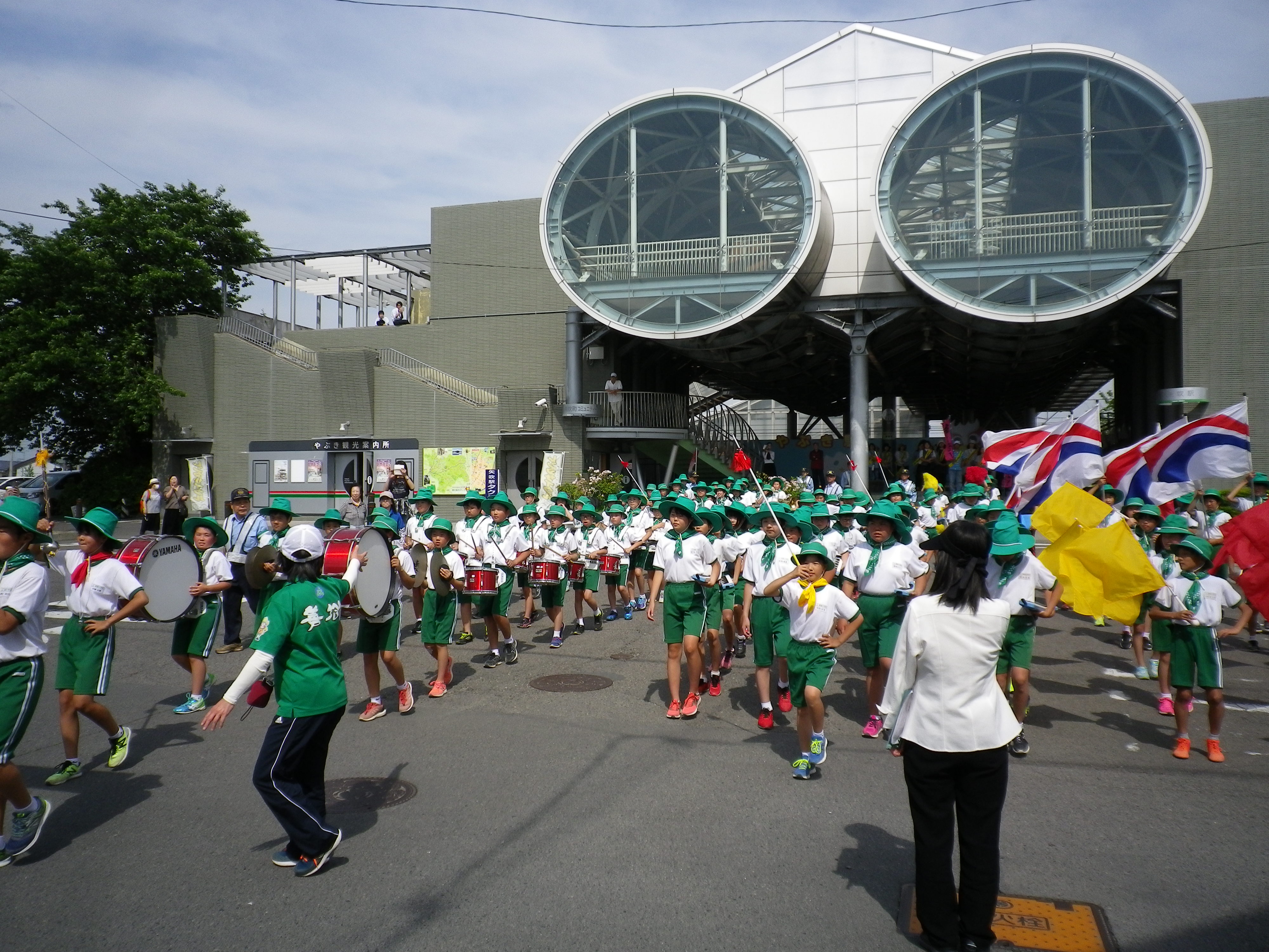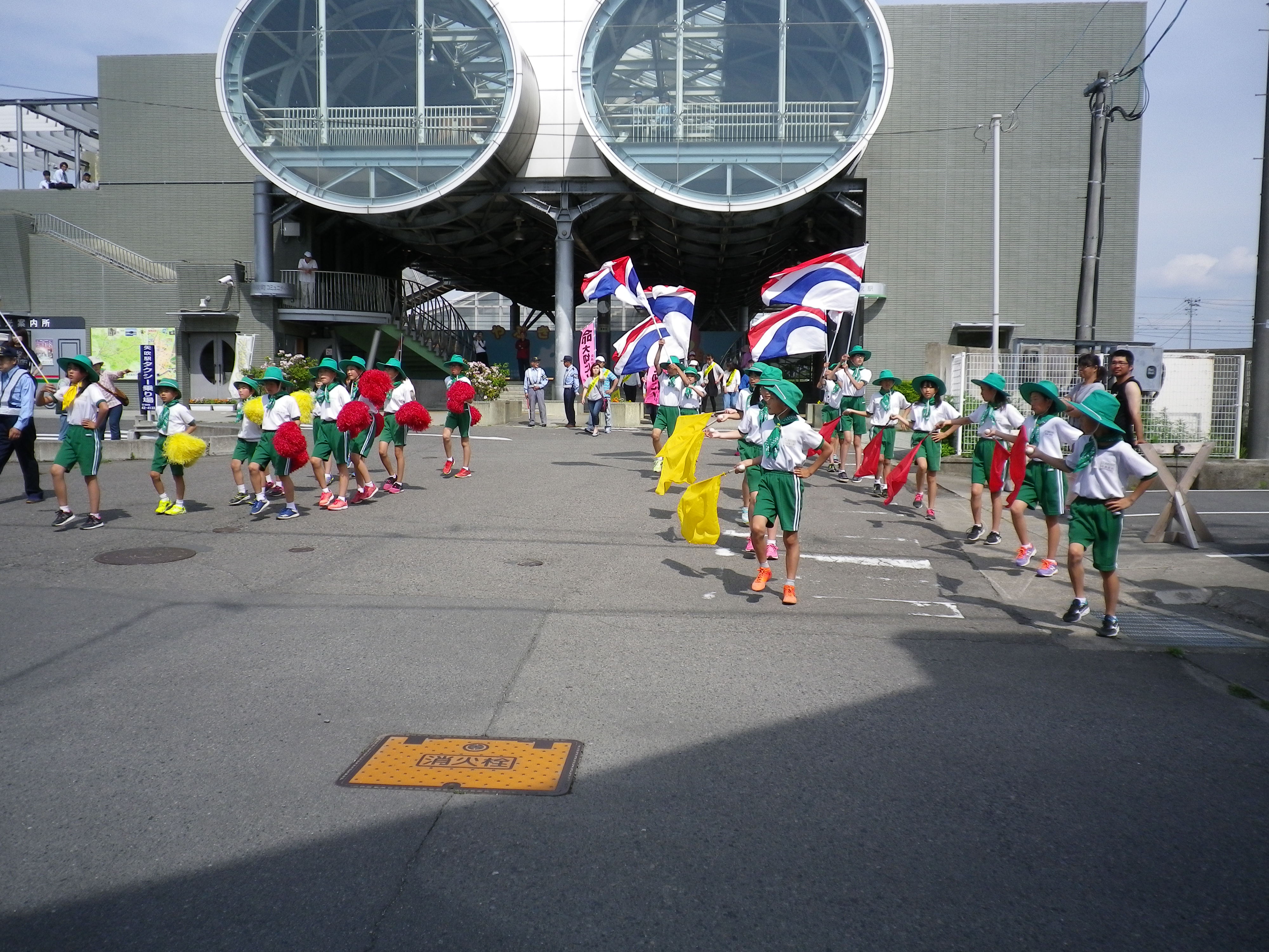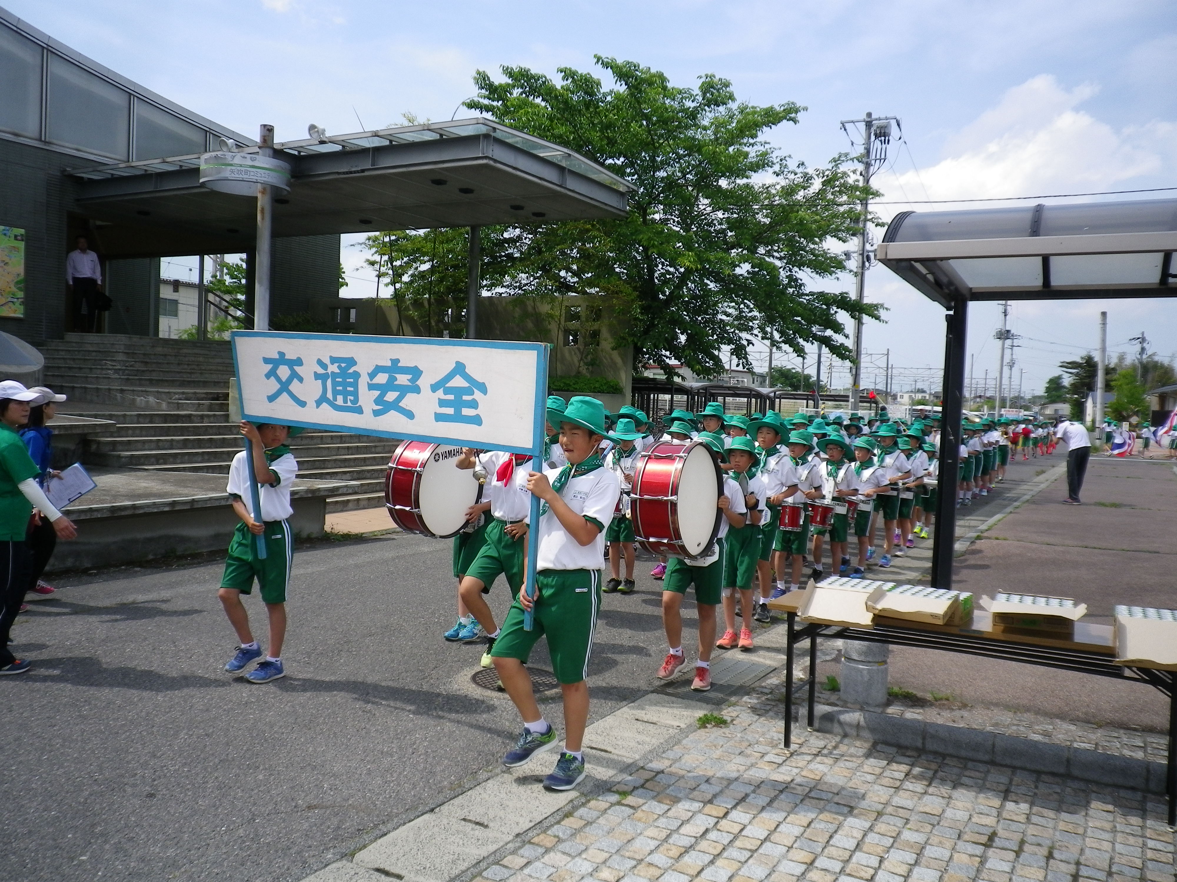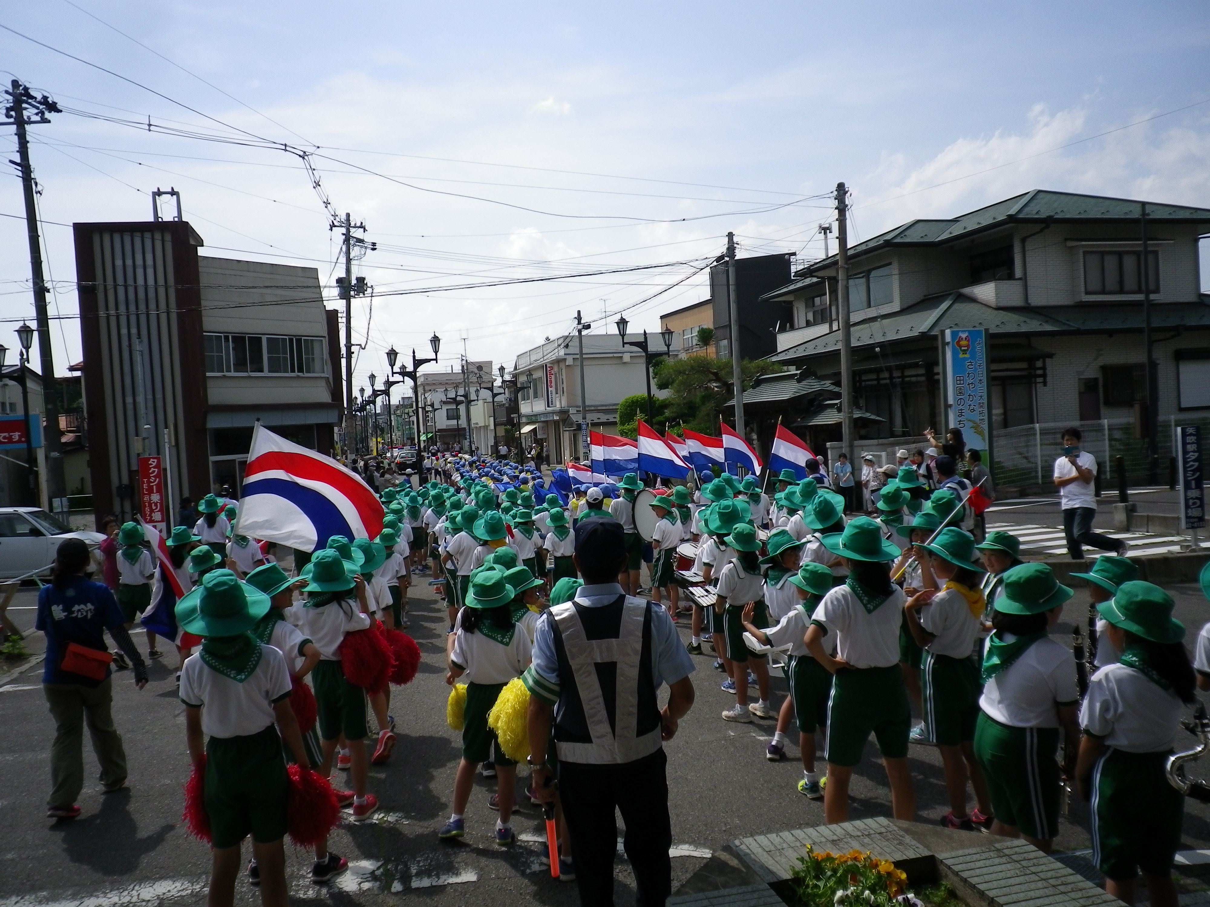 善郷小学校の開会式では、両校を代表して交通安全の誓いを安藤加夏さん、班長旗の受領を関根悠菜さんが行いました。二人とも立派な態度で大きな拍手をもらいました。スタートは善郷小学校です。1年生から4年生までが演奏を応援する中「校歌」と「アフリカンシンフォニー」を演奏しました。堂々とした演奏、きびきびとした演技に沿道の地域の方々が声援をおくる中で矢吹駅へと向かいました。矢吹駅では水分補給をして少し休憩して再び西口からスタートしました。ここからは矢吹小学校が先頭で後につづきました。町中での演奏は道路を堂々と歩きました。最後まで力をぬかずに演奏を続け無事に矢吹小学校の校庭に到着しました。