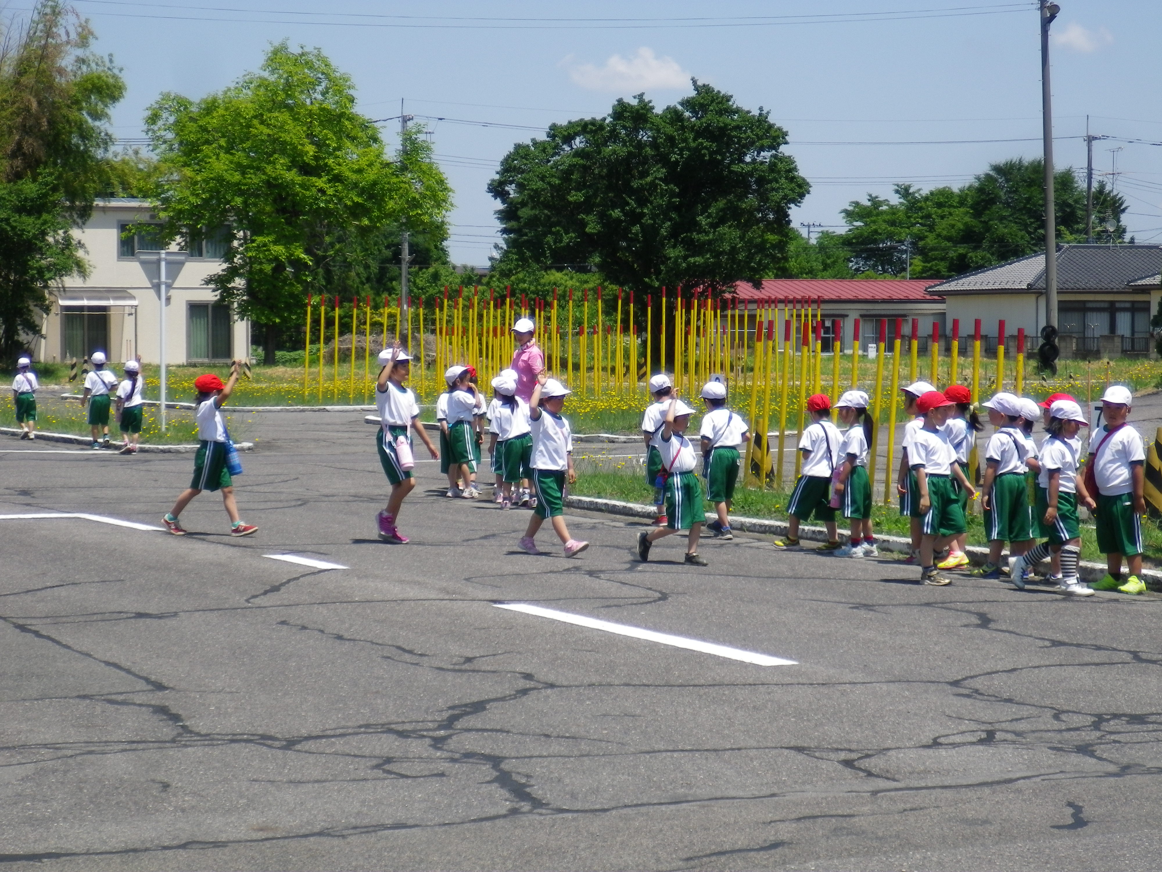 1年生、2年生、3年生は道路の安全な歩行の仕方について信号機のある交差点、信号機のない場所での左右の確認と横断の仕方を練習しました。真剣な表情で「右・左・右」と首を動かしながら確認することができました。
