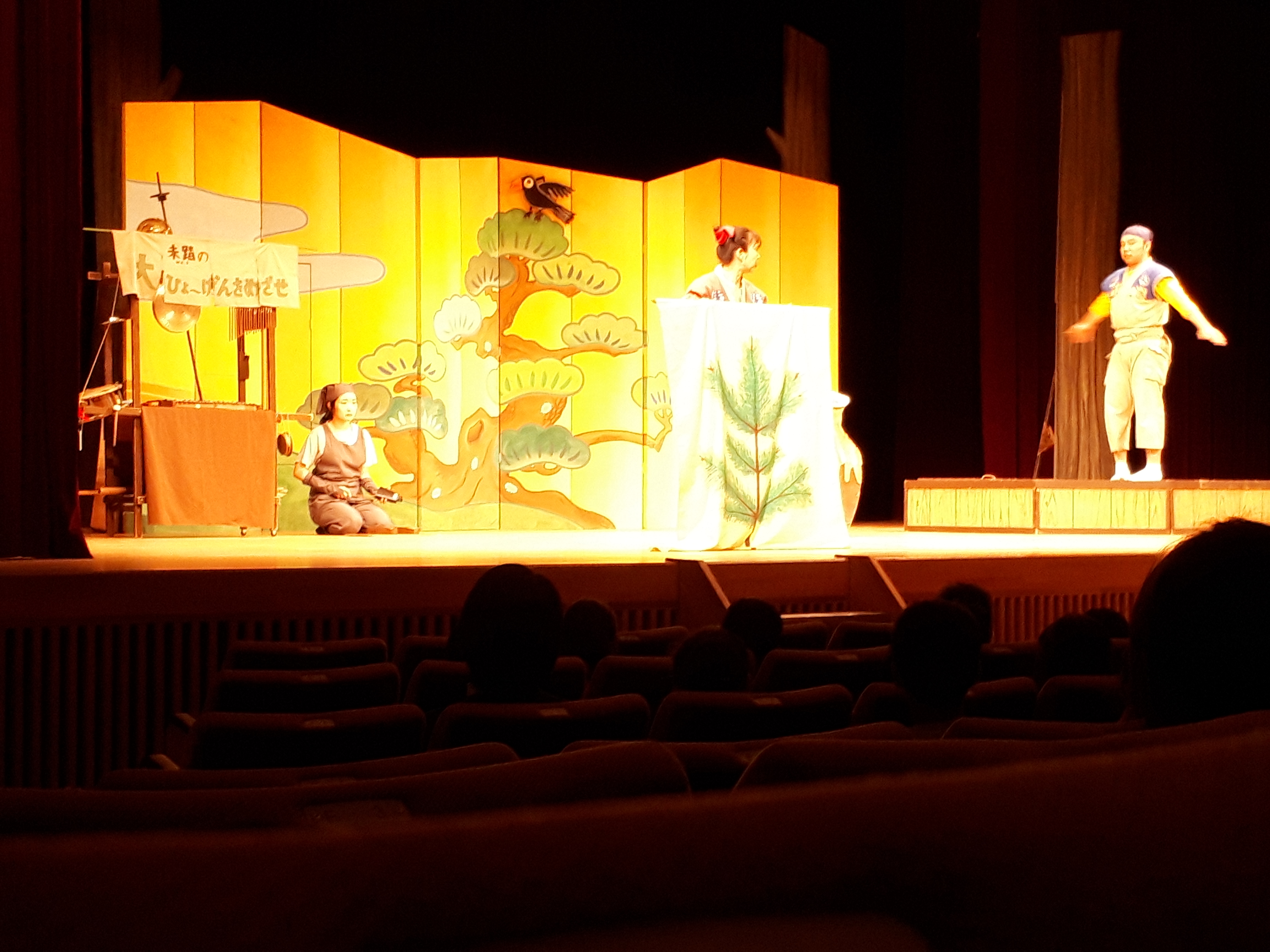 第1部は、低学年にも分かりやすい狂言劇で笑い声で会場がいっぱいになりました。京の町から山の修験者のもとにやってきた男女が、修行をごまかしたり悪だくみをしようとしてこらしめられるというストーリーでした。