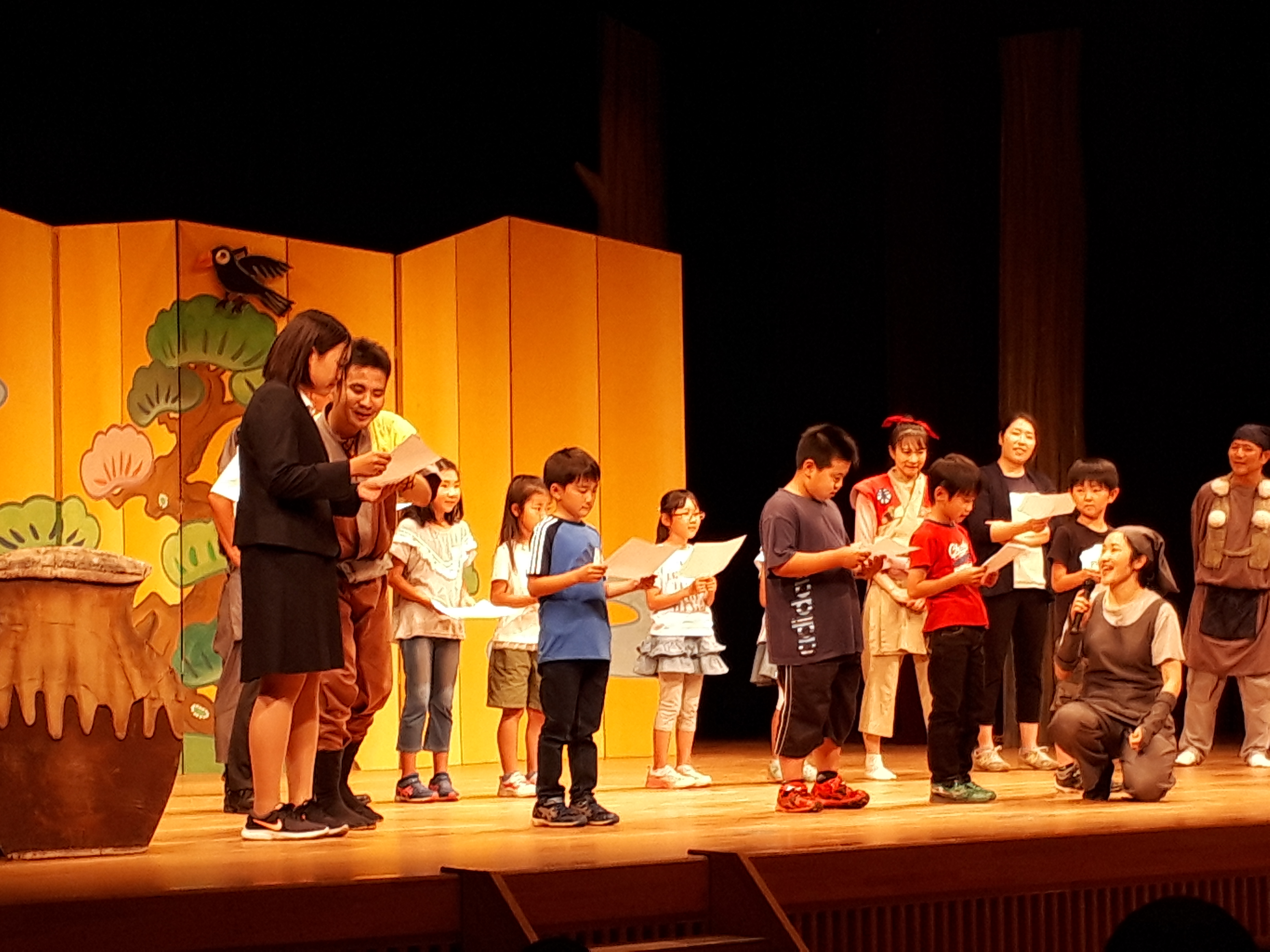 第2部は狂言についての説明を聞き、実際に手や体の動きを真似したり、せりふの言い回しにチャレンジしたりするもので楽しく参加していました。また、代表の子どもや先生方が舞台に上がって演技をしたり、長縄跳びをパントマイムでやったりしましたが、とても上手にできました。終わって帰る途中で「~でござりまする」などと言っているのが聞こえてきて、思わず笑顔になってしまいました。