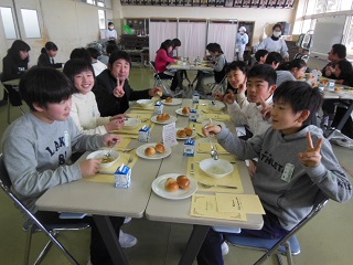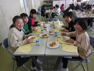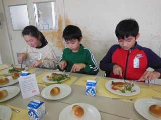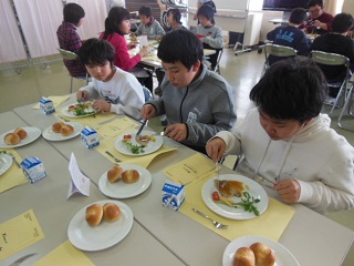 いつもの給食とは違ってちょっと緊張気味にテーブルに座っていましたが、おいしい料理が運ばれてくると、みんな笑顔になりました。