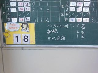 2月6日(火)の欠席者は18名で、インフルエンザによる欠席も10名と昨日よりちょっとだけ減りました。