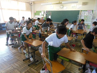 避難開始の合図から全校児童429名が避難完了するまでの時間は2分38秒でした。