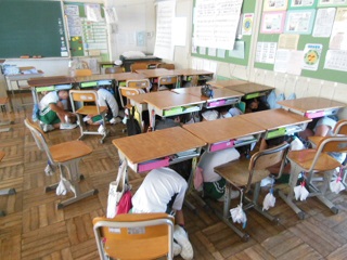 今朝北朝鮮がミサイルを発射したばかりということもあり、子どもたちは真剣に訓練に参加していました。
