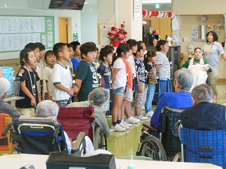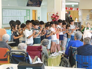 施設内を見学した後、ホームの方々を前に、歌やリコーダーの演奏を披露しました。