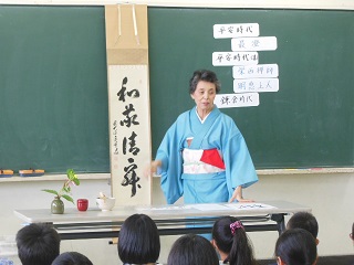 町内の茶道の先生にお出でいただき、まず茶道の歴史について学びました。