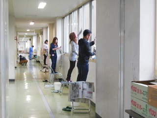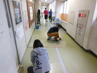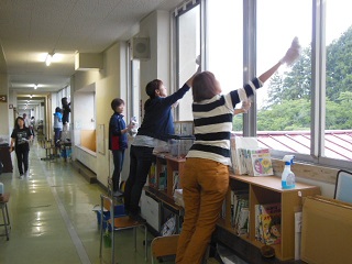 雨が降っていたので、外での作業は行わずに、校舎内の窓のガラス拭きと廊下の床磨きを行っていただきました。