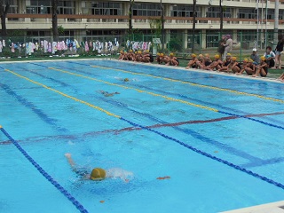 クラス対抗で点数を競い合い、25m泳ぎ切ると、一人につき10点が入ります。