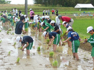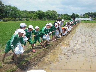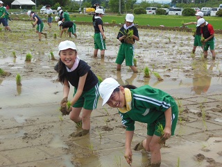 開校式の後、大池公園の隣にある田んぼで中畑小の5年生と合同で田植えをしました。