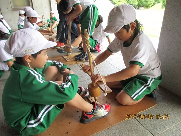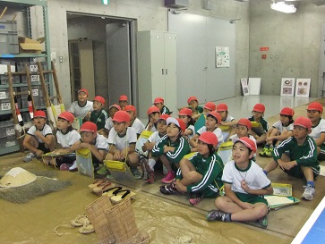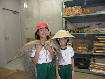 実際に蓑(みの)や笠を体に付けてみたり、火起こしの体験をしたりしました。