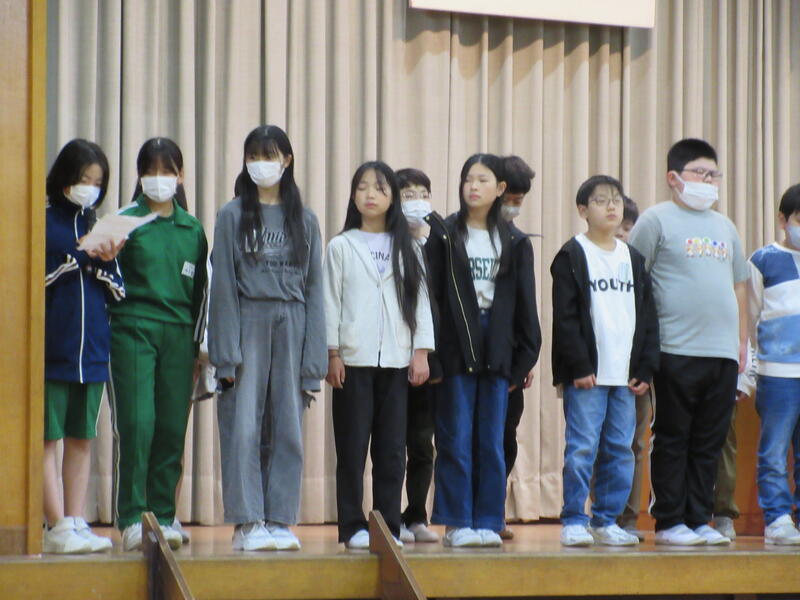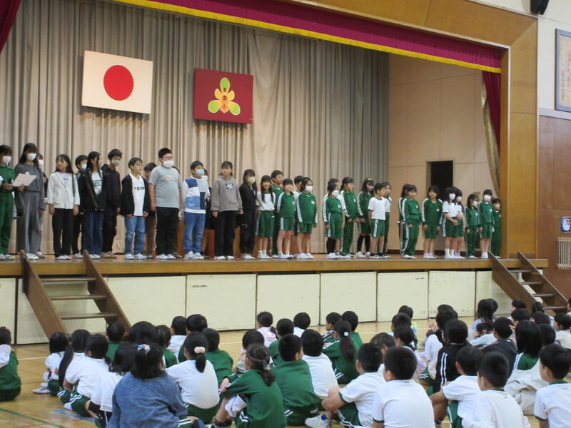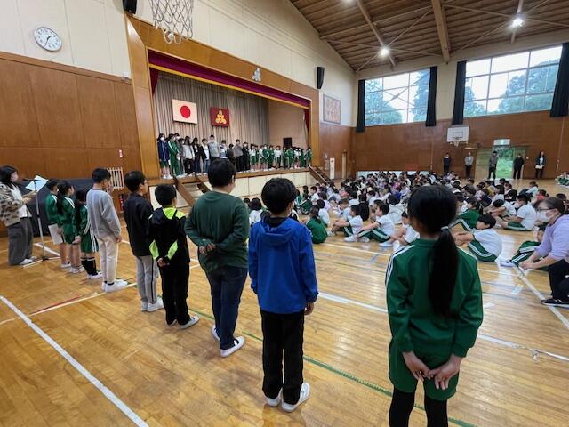 明日、喜多方市で行われる県下小・中学校音楽祭、日本学校合奏コンクール福島県大会に臨む吹奏楽クラブ員40人へ全校児童でエールをおくりました。