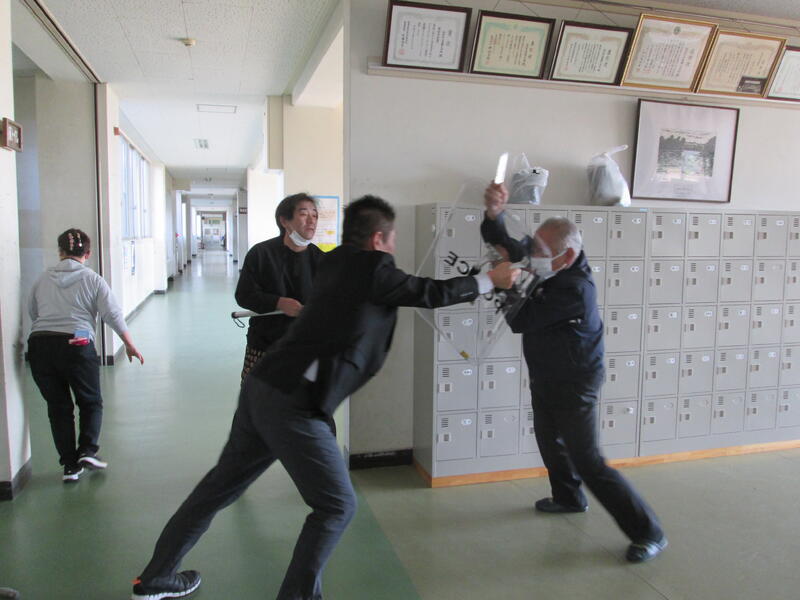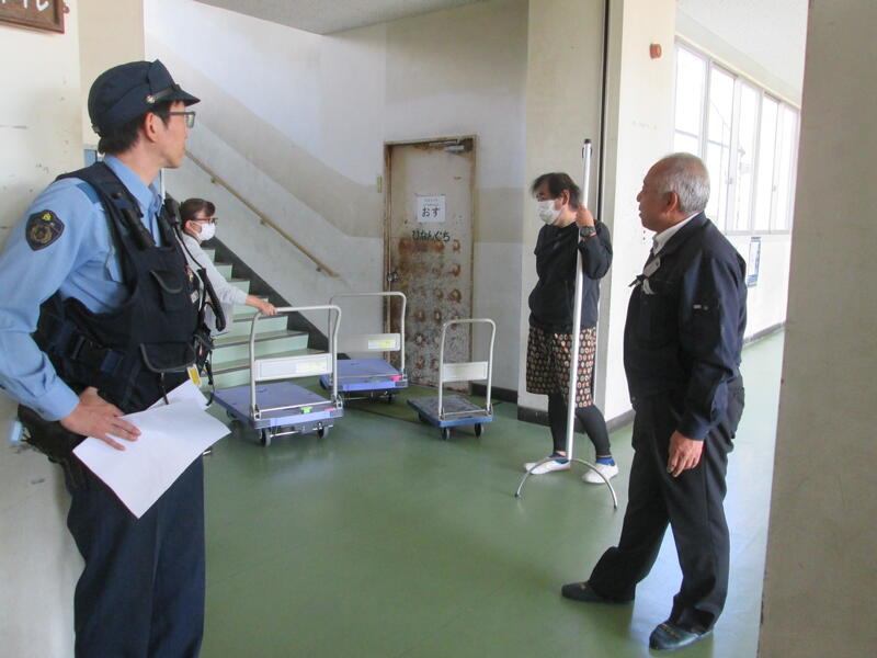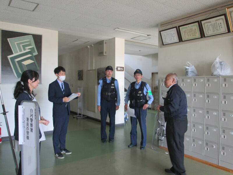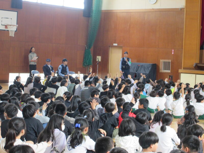 玄関より不審者が侵入したという想定で対応訓練を行いました。各教室では、放送に従って出入り口にバリケードをつくって侵入に備えて待機します。その後の全体会では、警察署員より講話をいただきました。「防犯は鍵かけから」施錠を万全にし、侵入させないことが一番であることをあらためて確認しました。