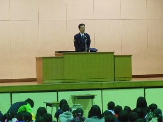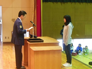 矢吹交番のおまわりさんから6年生代表児童に交通安全推進員の委嘱状が交付されました。