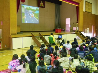 警察署の方のお話を聞いた後、交通安全のDVDを見て、安全な道路の歩き方、自転車の乗り方を学びました。