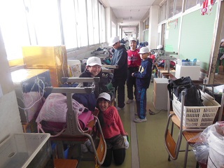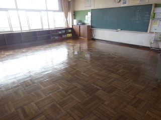 教室の机・椅子を廊下に出して、教室の床をみがきました。