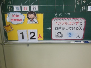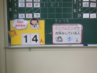 2月23日(木)、お休みは14人、そのうちインフルエンザによる出席停止は2人です。