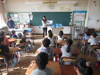 小学校の教員が幼稚園に出かけ、幼稚園の教室で年長さんを相手に模擬授業を行いました。