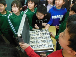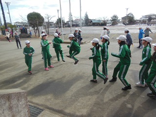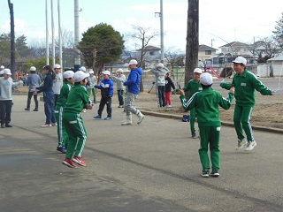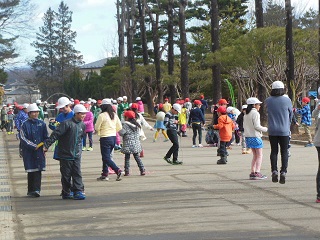 校庭は雪解けでぬかるんでいたので、校舎前の舗装された広場でなわとびをして遊ぶ子どもがたくさんいました。