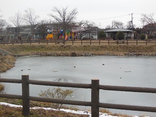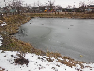 善郷小学校の近くの「小池公園」の池にも氷が張りました。