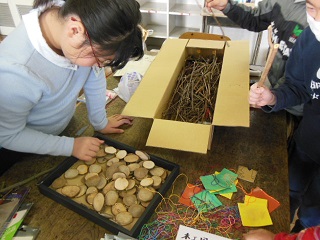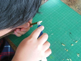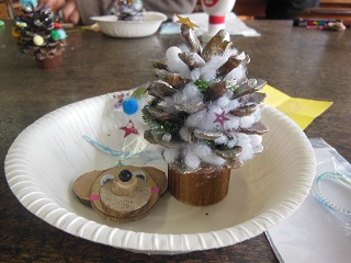 カッターナイフや切り出しナイフを使って枝を削ったり、木工用ボンドで貼ったりしながら、熊の顔のストラップや松ぼっくりのクリスマスツリーなどを作りました。