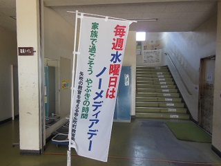中央昇降口の階段のところに、「毎週水曜日はノーメディアデー」の幟旗が立ち、子どもたちに「ノーメディアデー」を知らせます。