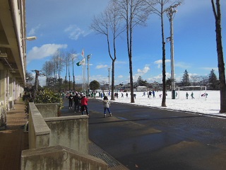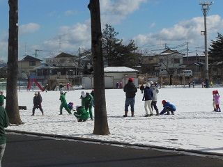 校庭は雪で真っ白になっていますが、子どもたちは外で元気に遊んでいます。