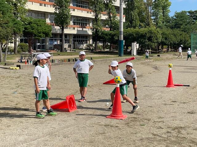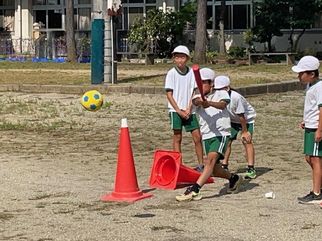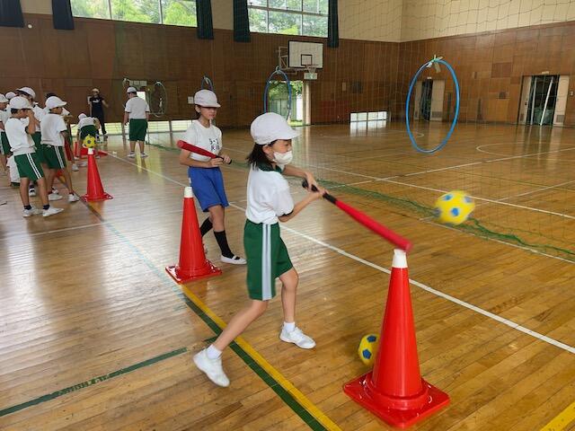 「バットを思い切り振ってボールを遠くへ飛ばす」ことはベースボール型ゲームの醍醐味です。室内での練習を経て野外でゲームを楽しみます。