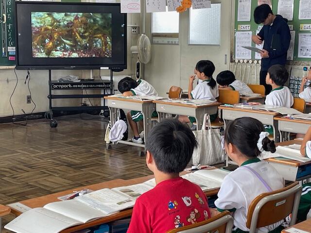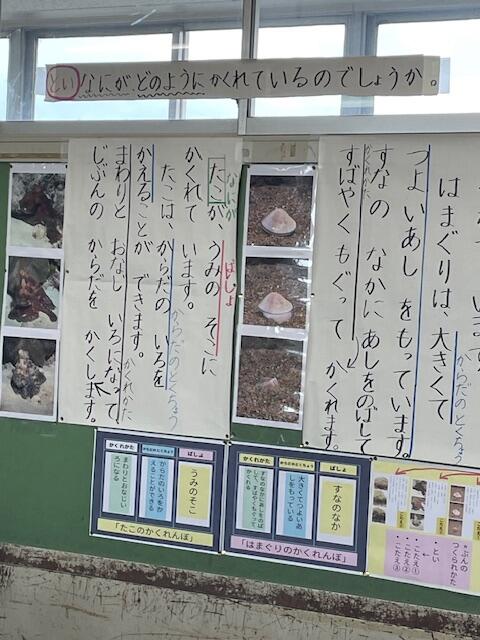 海の中で生活する生きものには、様々な方法で自分の身を隠すものがあります。ハマグリは砂の中に潜り、タコは体の色を変化させます。今日は3つめの生きもの「モズクショイ」についてその隠れ方について学習します。説明文の構成を踏まえ、動画を確認しながら説明文を読み解きます。(モズクショイはカニの一種で、モズク=海藻ををハサミで小さく切って体に貼り付けて海藻になりすますのだそうです。)