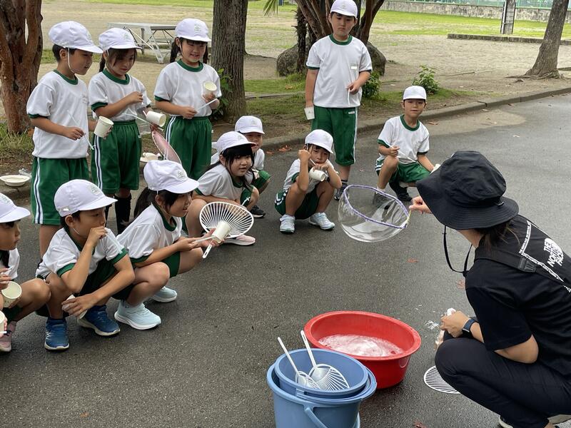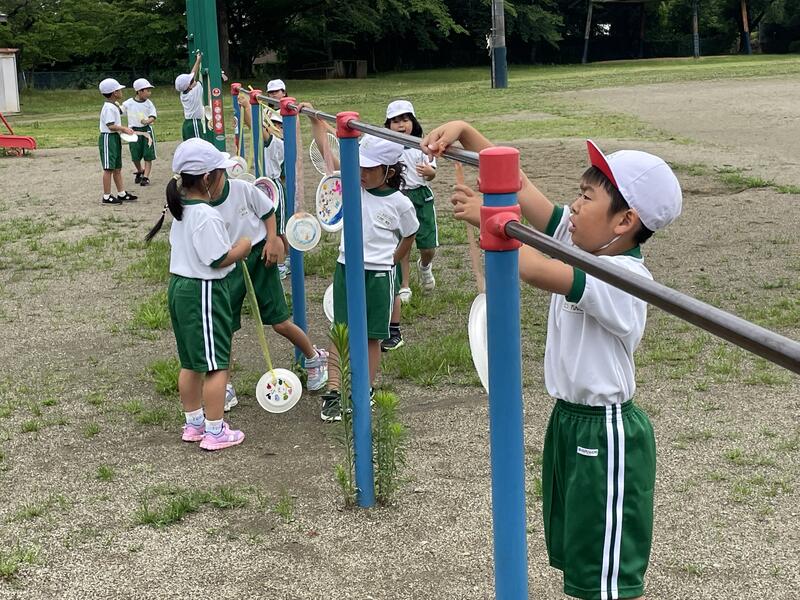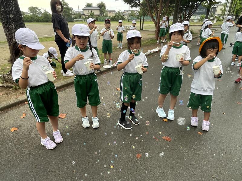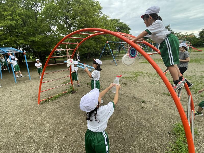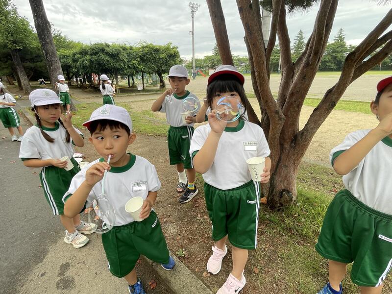 「夏の遊び」は様々ですが、この日子ども達は水でっぽうとシャボン玉で遊びました。ケチャップやマヨネーズ、ペットボトルを再利用した水でっぽうで、紙皿の的をねらいました。