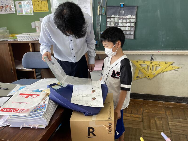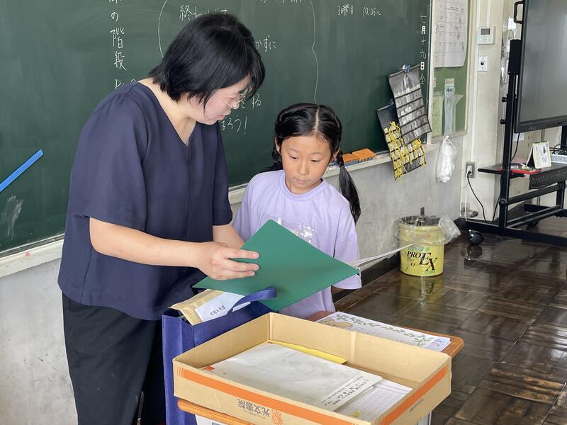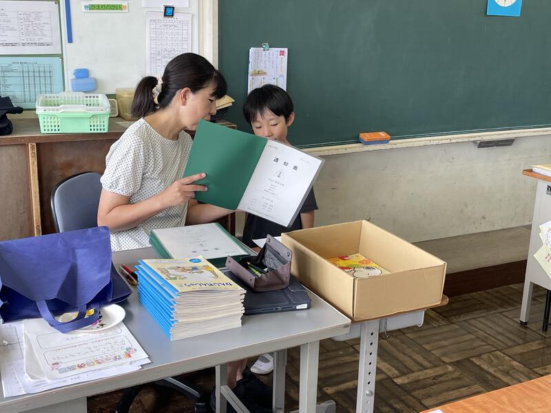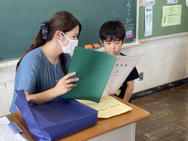 終業式の後は、各教室で担任から通知表が子ども達に手渡されました。今年度から、通知表がリニューアルしています。表彰等は学校代表として出場(出品)して入賞したものを記述します。また、文章表記による評価は年度末にまとめて行うため、担任が1学期のがんばり等について一言添えながら通知表を手渡しました。
