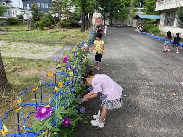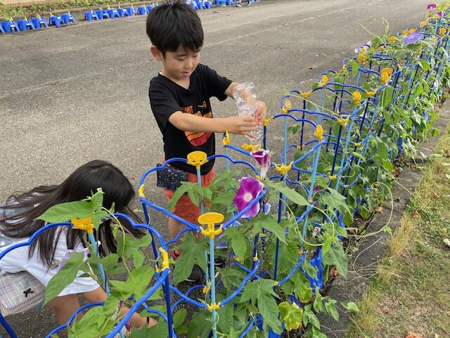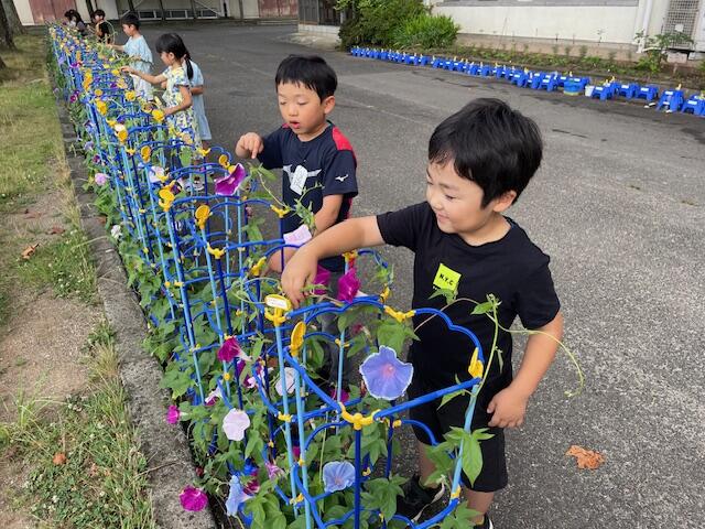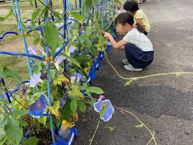 5月に蒔いたアサガオのタネ。1ヶ月半で大きく育って大輪の花を咲かせています。日々せっせと水やりと観察を続けてきた1生生、毎朝感動から1日が始まります。