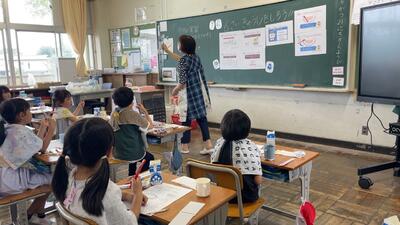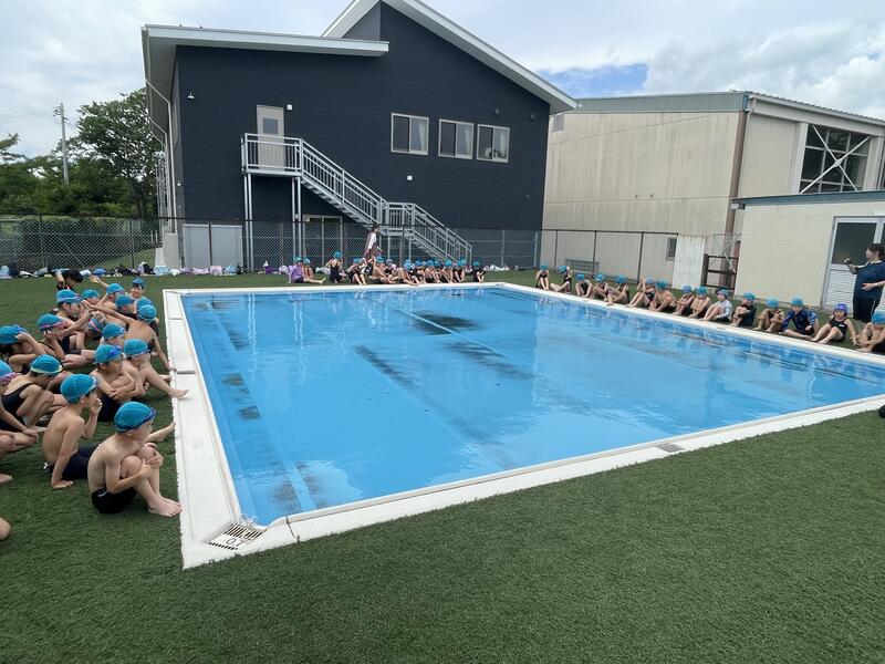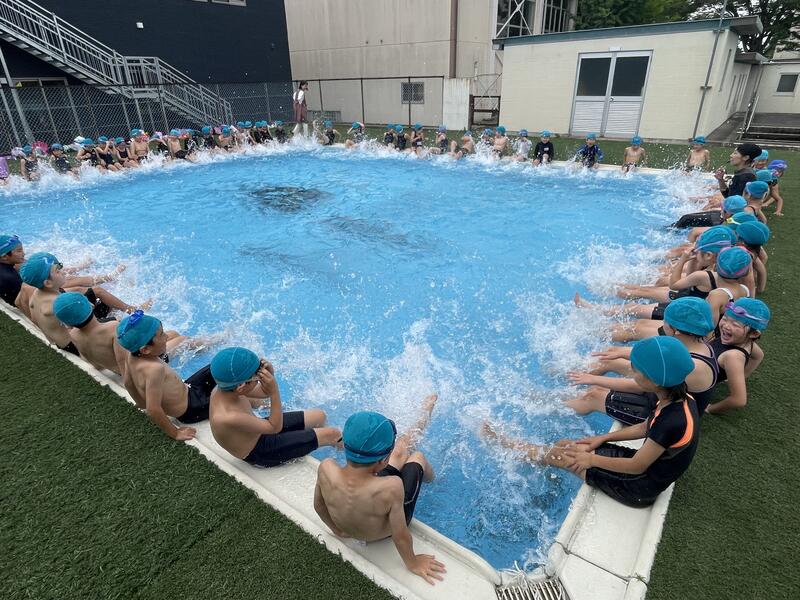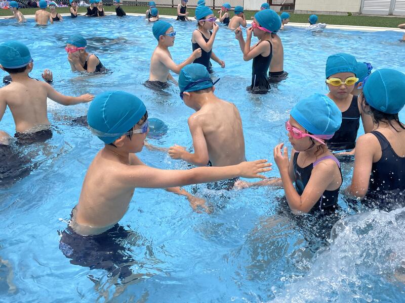 今日は1・2年生が初泳ぎです。本校には、水慣れに最適なサブプールがあるので水が苦手な子どもも安心です。学習の約束をしっかりと確認したあと、みんなで楽しく水の感触を味わいました。