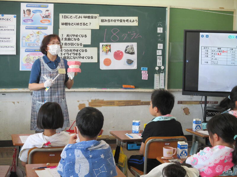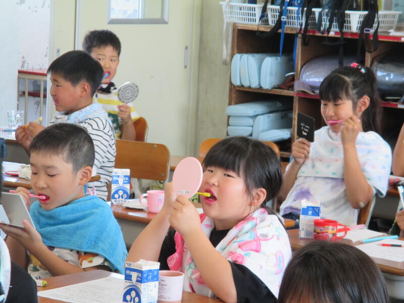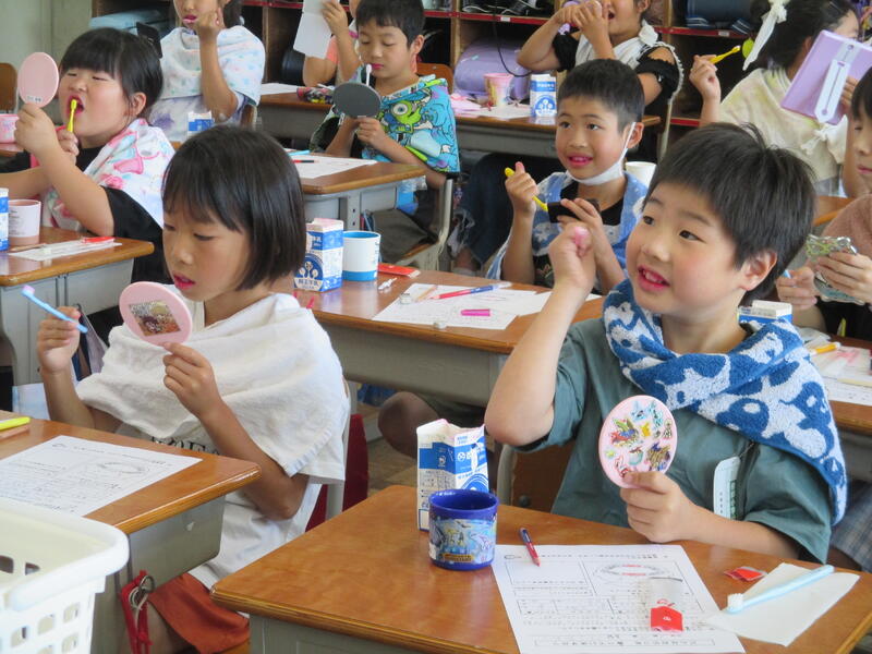 6月は口と歯の健康月間です。口腔の健康の維持が心臓病などの生活習慣病を予防することにつながるということが明らかになっています。全ての学年で歯科衛生士からむし歯発生の仕組みや正しいブラッシングの仕方について指導を受けています。正しく磨けているか、テスターを使った染め出しをして磨き残しのチェックもしています。