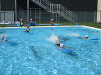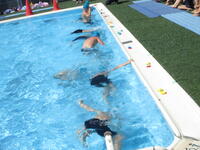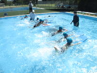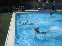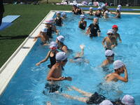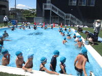 今日の2・3時間目に、1年生の水泳記録会を行いました。よく晴れた青空の下、1年生は元気いっぱい、初めての水泳記録会に臨みました。「10メートルビート板」と「貝拾い」で、今までの学びの成果を十分に発揮して、頑張り抜いていました。見ている子ども達は、頑張っているお友達を大きな声で応援することができました。さいごに、みんなで自由遊びをするなど、楽しい活動をすることができました。
