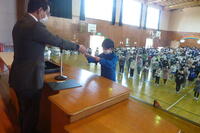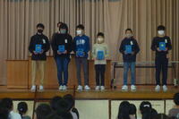 修了式に先立って、6年生も体育館に集まり、6年生の皆勤賞の表彰も行いました。皆勤賞は、志賀春道さん、須藤悠太さん、根本旺甫さん、加藤佑佳さん、坂口瑠愛さん、鈴木碧真さんの6名でした。