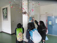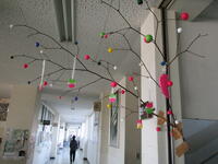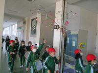 団子さしとは、小正月(1月15日)に行う行事のひとつで、みず木の枝に上新粉で練って丸めた団子をさし、豊作や家内安全、無病息災を祈るものです。本校の栄養技師が、子ども達に見てもらいたいと、用務員さんにミズキの木を持って来てもらって、飾りをつけました。団子は上新粉ではなく紙粘土などで作りましたが、団子さしを飾るとちょっぴり華やかな雰囲気になりました。