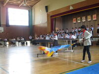 10月12日(水)に喜多方市の喜多方プラザで行われる「県下小中学校音楽祭」に出場する特設吹奏楽クラブの壮行会をお昼の放送で行いました。児童会運営委員会の皆さんが進行などの役割を行い、会を進めてくれました。指揮者の松本紘朗先生から、演奏曲の「鳳が如く~祭り~」の紹介があり、児童を代表して6年の真壁唯輝さんが励ましの言葉をのべ、吹奏楽クラブを代表して6年の山田凜さんが県大会への決意を述べました。