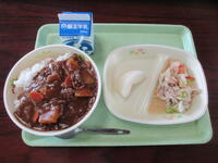 この日の給食は、食育事業の一環で、旬の食材や福島県産の食材を使ったメニューでした。献立は、ハヤシカレーライス・トマトマリネサラダ・梨・牛乳です。福島県産の食材は、牛肉・タマネギ・トマト・梨です。ハヤシライスカレーには、牛肉が使われていて少し贅沢な気分になりました。栄養士の先生が献立を考え、調理員さん達が心を込めてつくってくれる善郷小学校の給食は、いつもおいしいです。ありがとうございます。