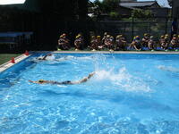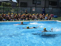 お日様に照らされて、絶好のコンディションの中、5年生の水泳記録会を行いました。自由形や平泳ぎなどの種目を通して、今までの学習の成果を出そうと自分の力を出し切って頑張る姿がたくさん見られました。