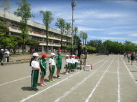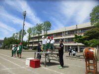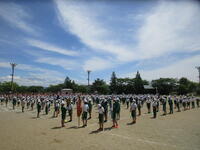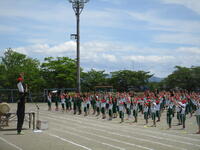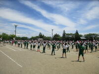 晴天の下、全学年の児童が校庭に集まって、運動会全体練習を行いました。開会式や閉会式、ラジオ体操、応援合戦の練習を行いました。