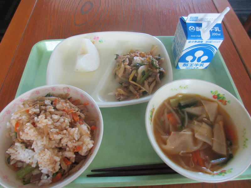 キムチとビビンバは韓国の料理で、ワンタンスープは中華料理です。ビビンバの野菜には病気を予防する効果があるそうです。野菜が苦手な子ども達もおいしそうに食べていました。今日の給食クイズもありました。(放送で給食委員会の皆さんが発表しました。)